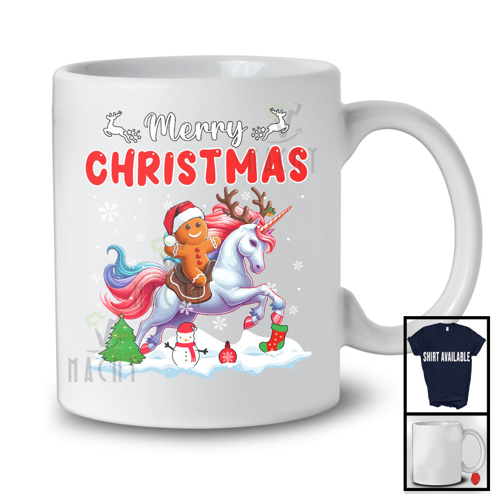 Merry Christmas; Joyful X-mas Santa Gingerbread Riding Unicorn; Snowing Animal Lover T-Shirt. This cotton t-shirt is a durable staple product with a classic fit. One of the most popular items, it has a relaxed style made for everyday and casual wear.