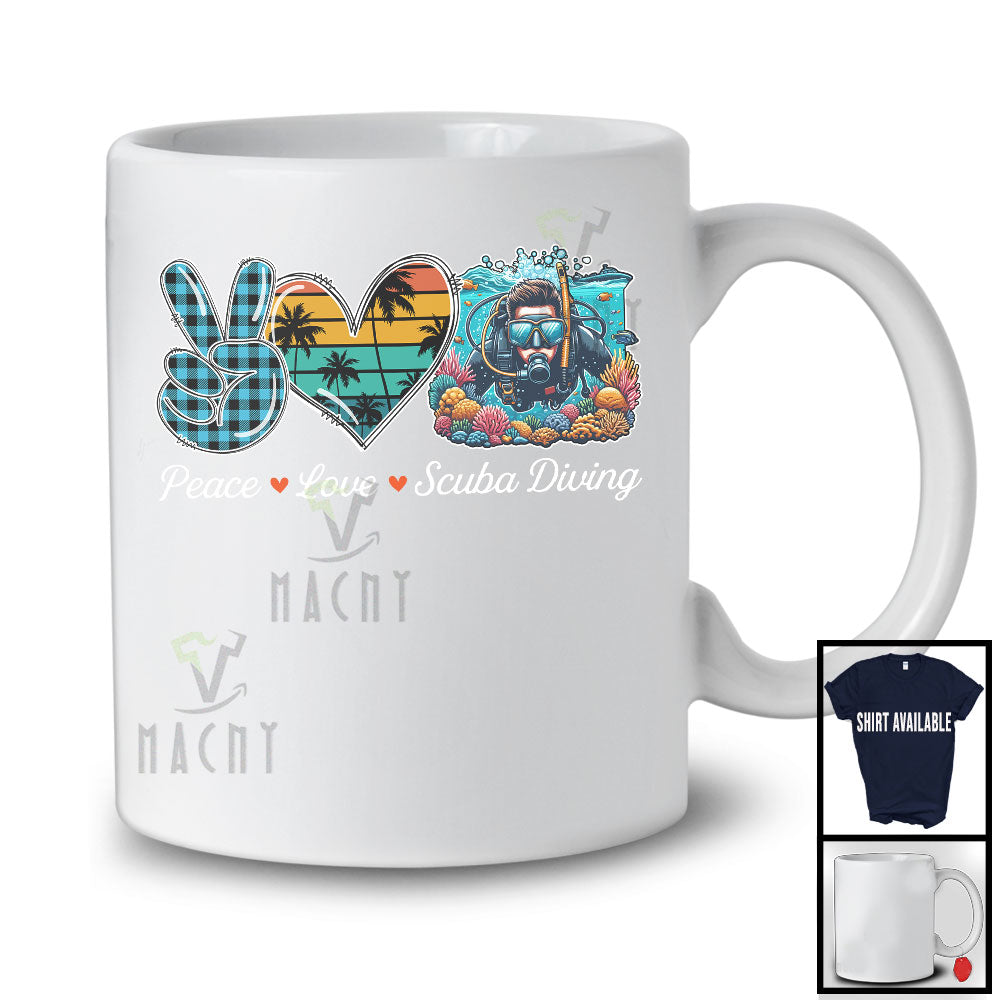 Peace Love Scuba Diving, Lovely Summer Vacation Plaid Peace Hand Sign Heart, Scuba Diving Team T-Shirt. This cotton t-shirt is a durable staple product with a classic fit. One of the most popular items, it has a relaxed style made for everyday and casual wear.