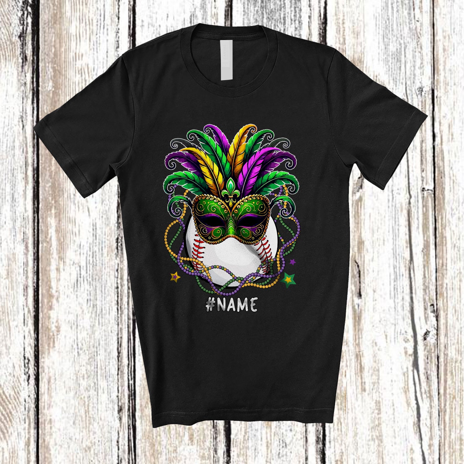 Personalized Baseball Wearing Mask; Amazing Mardi Gras Beads; Custom Name Sport Player Team T-Shirt. This cotton t-shirt is a durable staple product with a classic fit. One of the most popular items, it has a relaxed style made for everyday and casual wear.