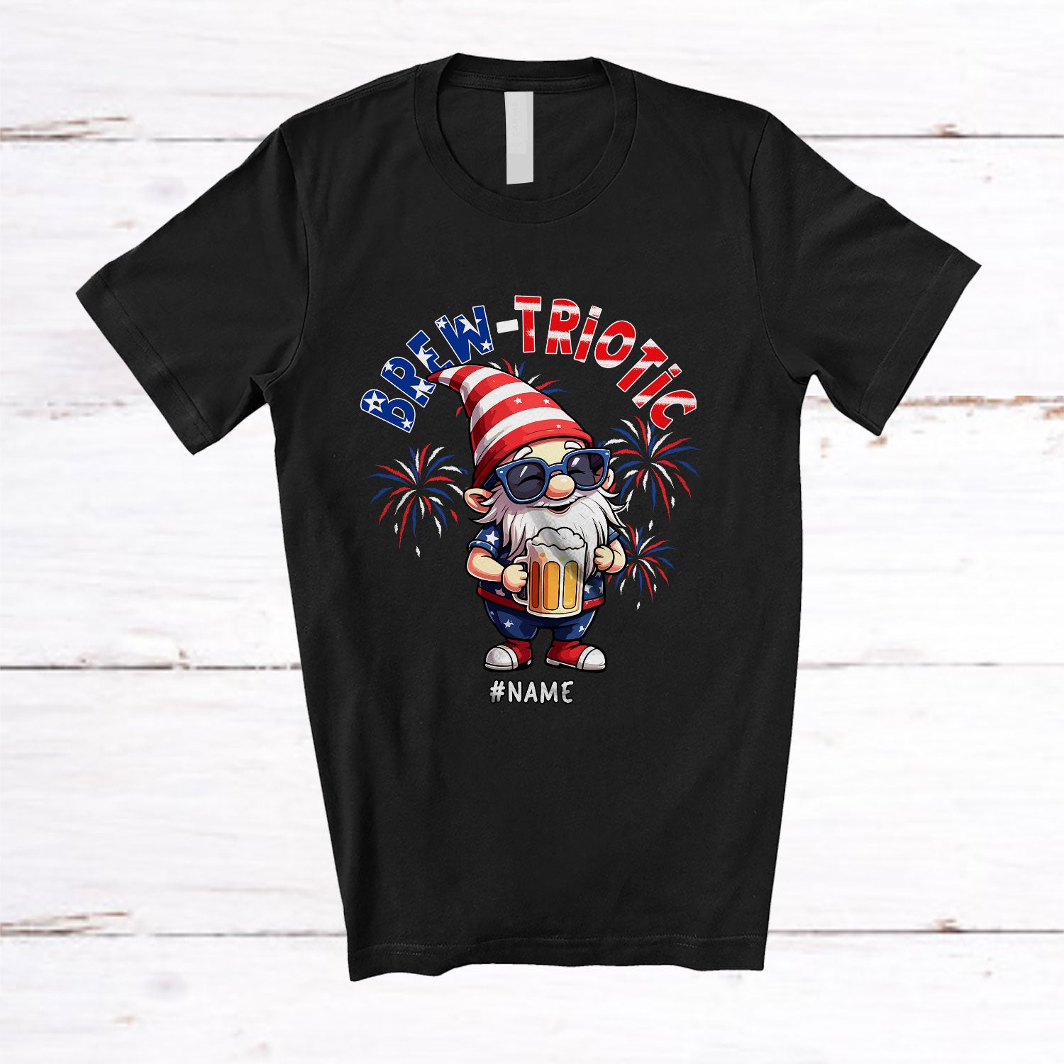 Personalized Brew-triotic; Cheerful 4th Of July Gnome Drinking Beer; Custom Name Patriotic T-Shirt