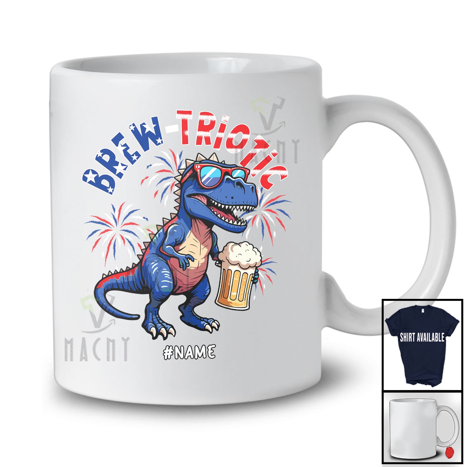 Personalized Brew-triotic; Cheerful 4th Of July T-Rex Drinking Beer; Custom Name Patriotic T-Shirt