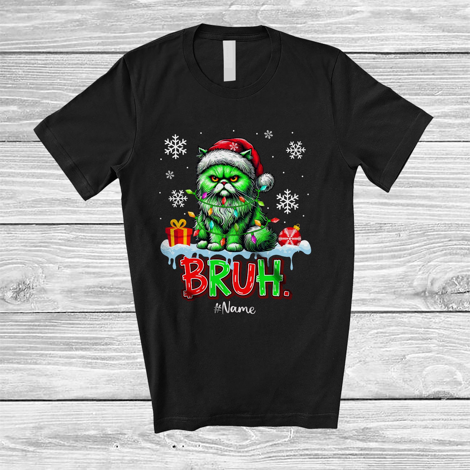 Personalized Bruh; Lovely Christmas Santa Green Cat; Custom Name Cat Owner; X-mas Family T-Shirt