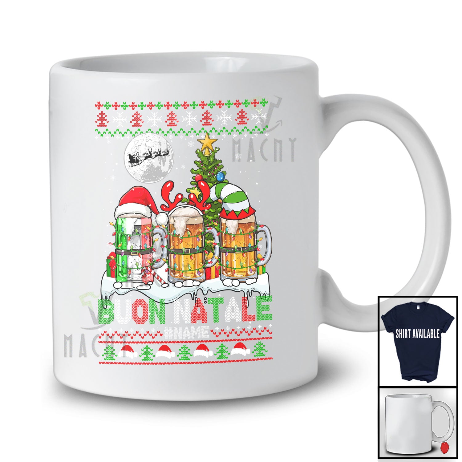 Personalized Buon Natale; Joyful Christmas Custom Name Italian Beer of Glasses; Sweater Drinking T-Shirt. This cotton t-shirt is a durable staple product with a classic fit. One of the most popular items, it has a relaxed style made for everyday and casual wear.