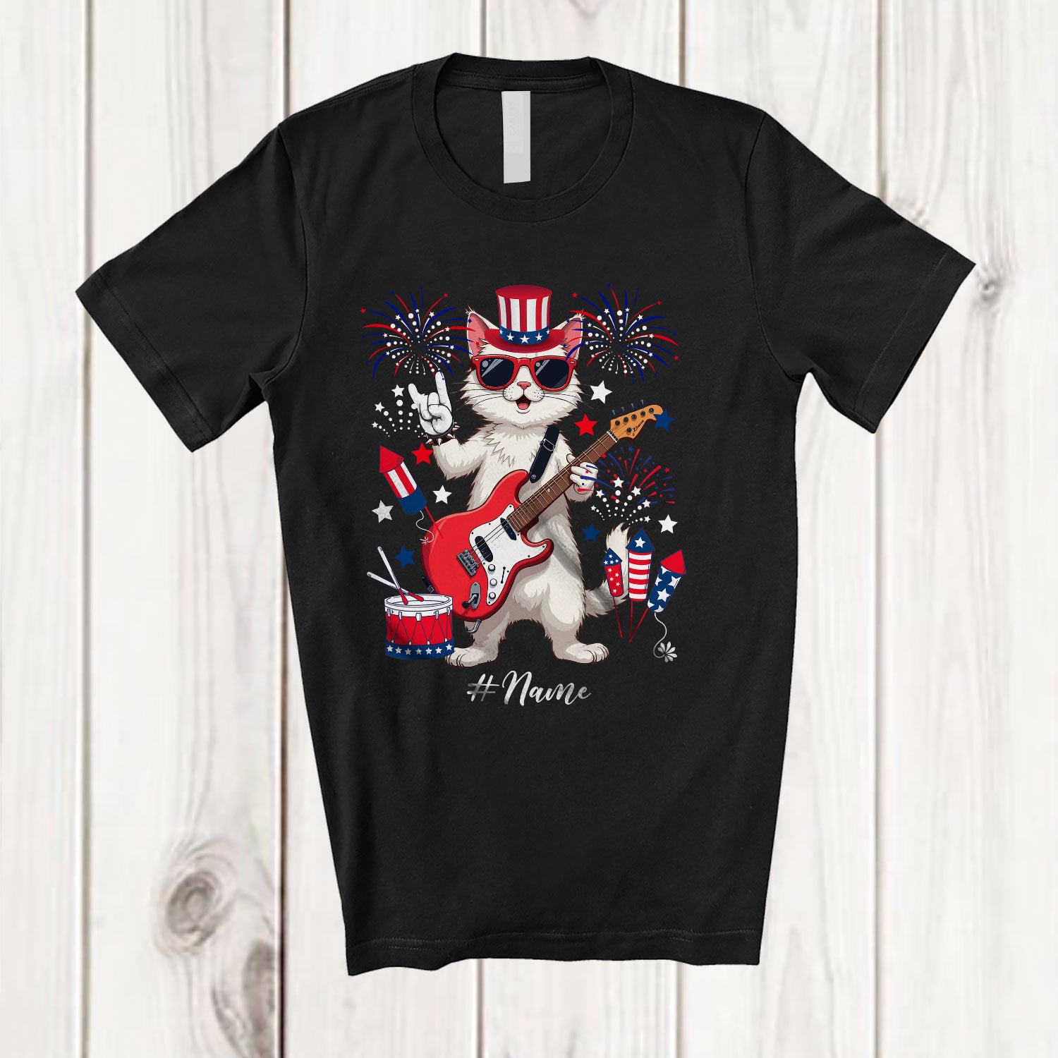 Personalized Cat Rock; Lovely 4th of July Cat Sunglasses Bass Player; Custom Name Guitarist T-Shirt
