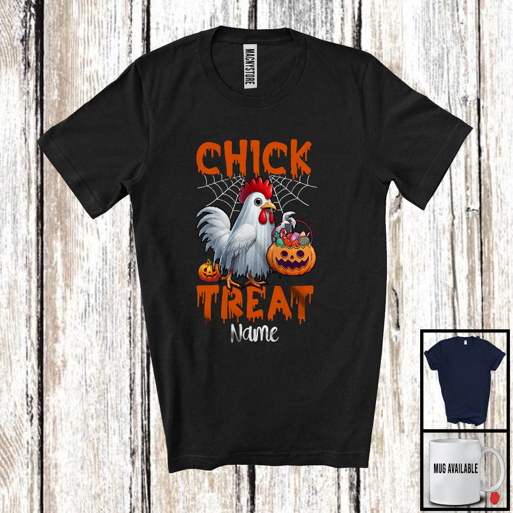Personalized Chick Or Treat, Humorous Halloween Custom Name Hen Chicken, Trick Or Treat Farmer T-Shirt. This cotton t-shirt is a durable staple product with a classic fit. One of the most popular items, it has a relaxed style made for everyday and casual wear.