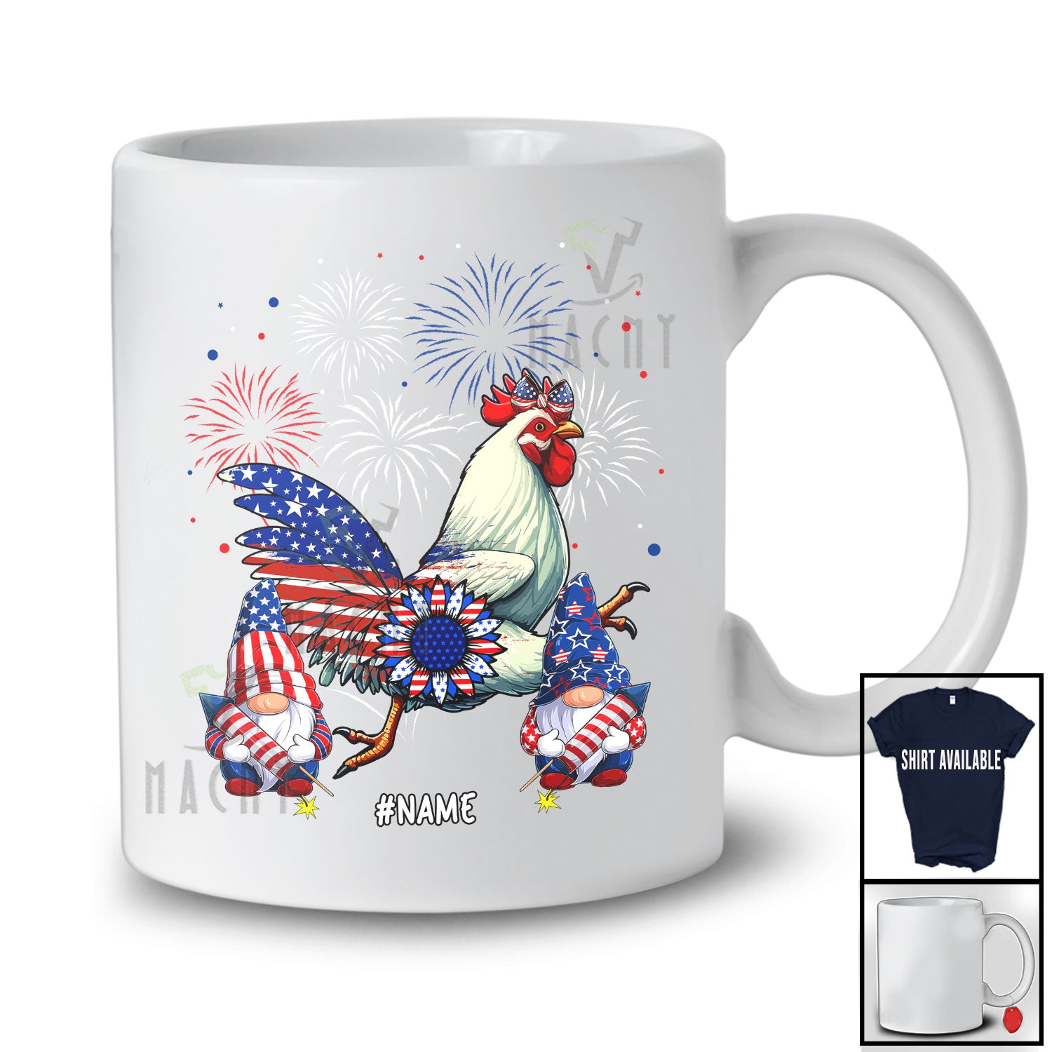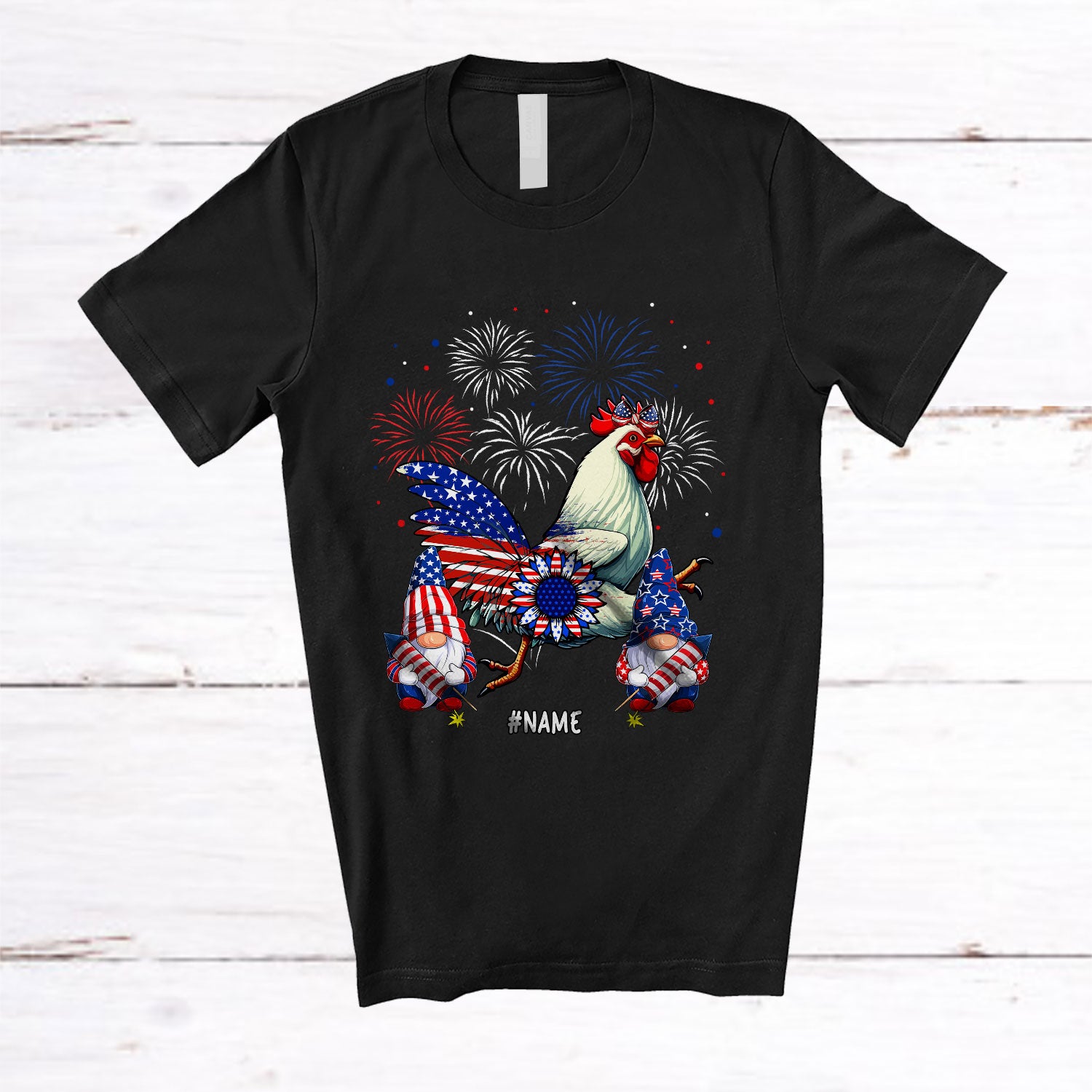 Personalized Chicken With Headband US Flag; Adorable 4th of July Custom Name Patriotic Sunflower T-Shirt. This cotton t-shirt is a durable staple product with a classic fit. One of the most popular items, it has a relaxed style made for everyday and casual wear.