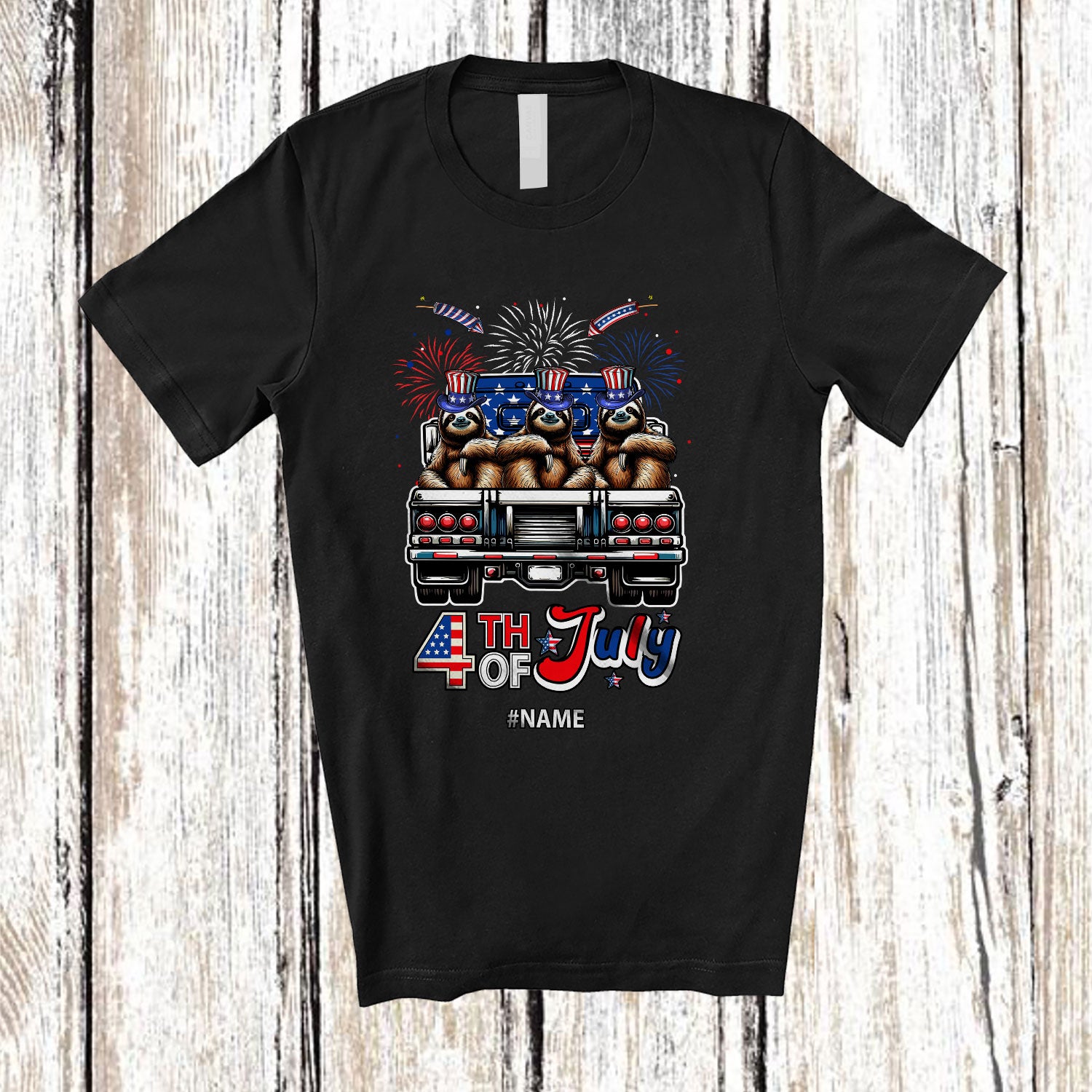 • Personalized Custom Name 4th of July; Lovely Three US Flag Sloth On Truck; Patriotic T-Shirt. This cotton t-shirt is a durable staple product with a classic fit. One of the most popular items, it has a relaxed style made for everyday and casual wear.