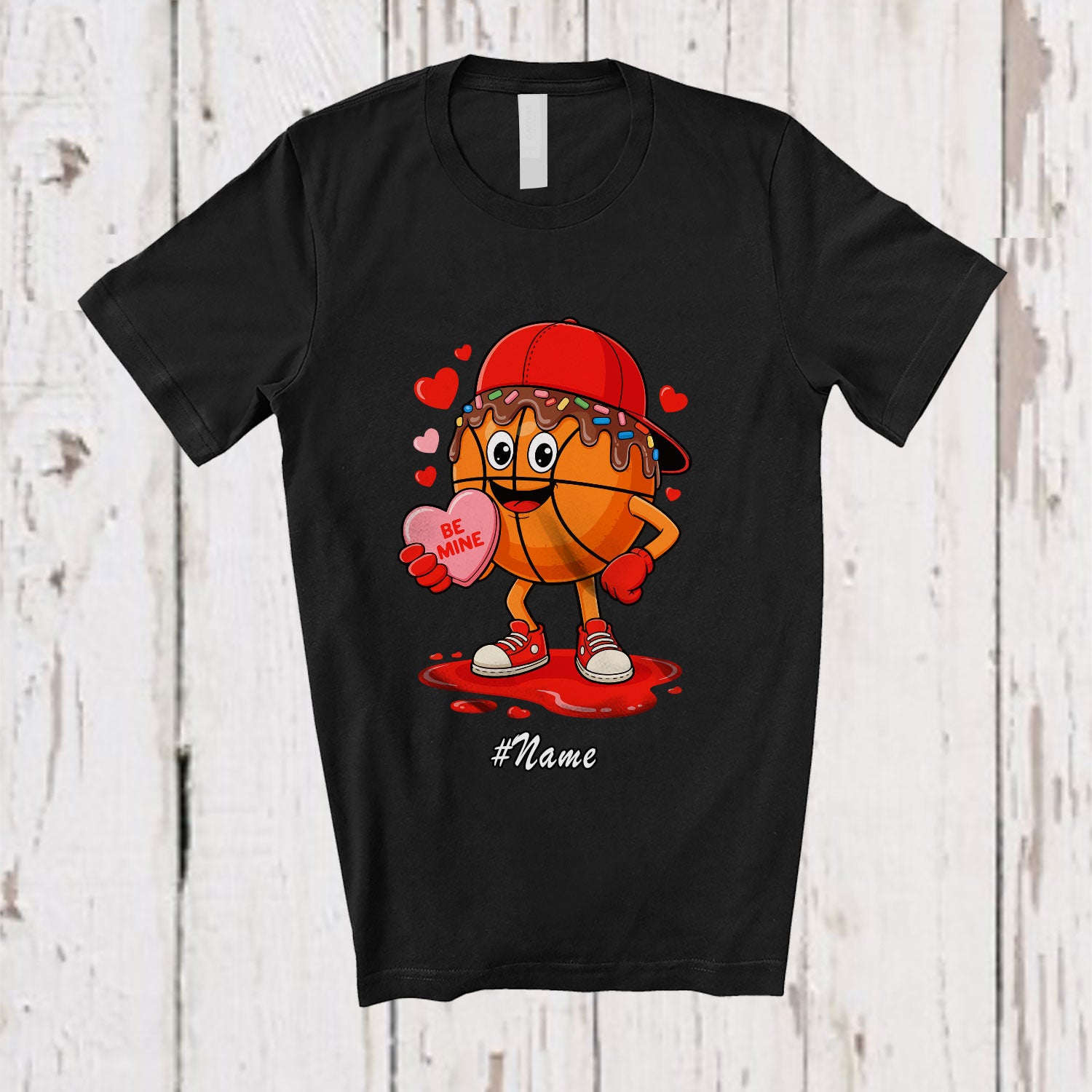 • Personalized Custom Name Basketball Dripped Valentine; Humorous Hearts Sport Player Team T-Shirt. This cotton t-shirt is a durable staple product with a classic fit. One of the most popular items, it has a relaxed style made for everyday and casual wear.