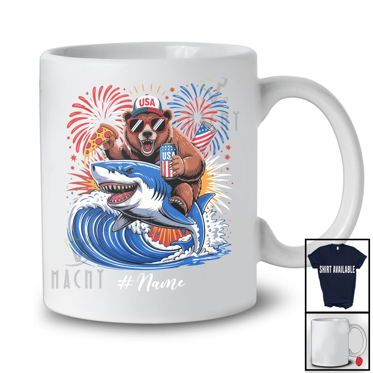 • Personalized Custom Name Bear Riding Shark Drinking Eat Pizza; Lovely 4th Of July Patriotic T-Shirt. This cotton t-shirt is a durable staple product with a classic fit. One of the most popular items, it has a relaxed style made for everyday and casual wear.