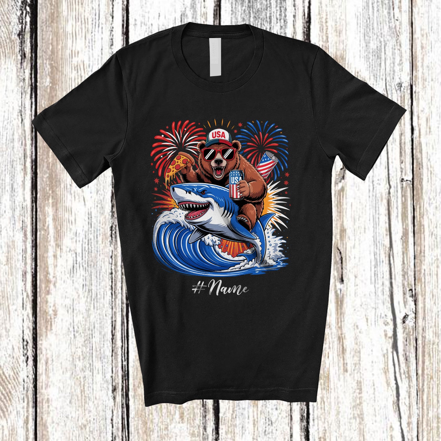 Personalized Custom Name Bear Riding Shark Drinking Eat Pizza; Lovely 4th Of July Patriotic T-Shirt