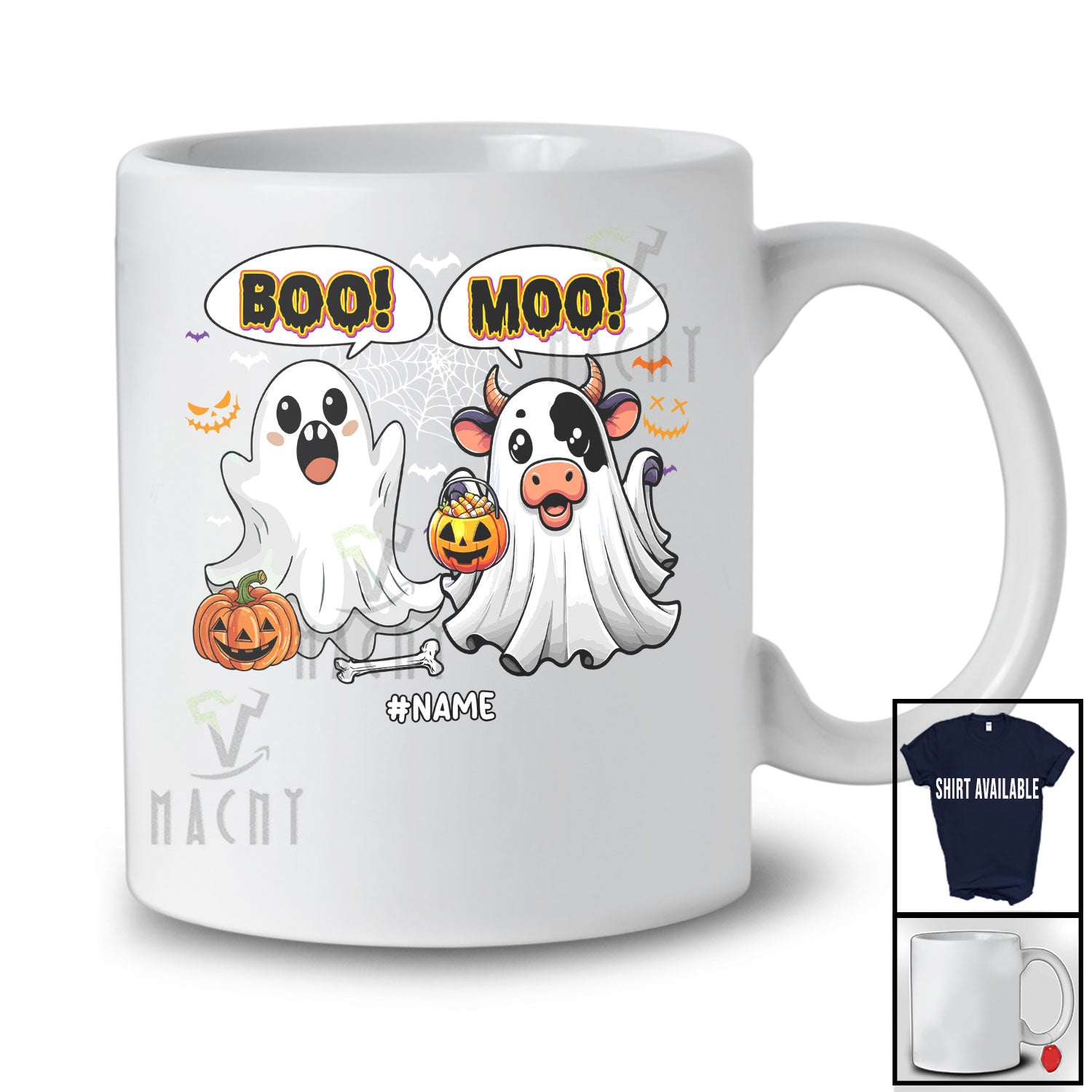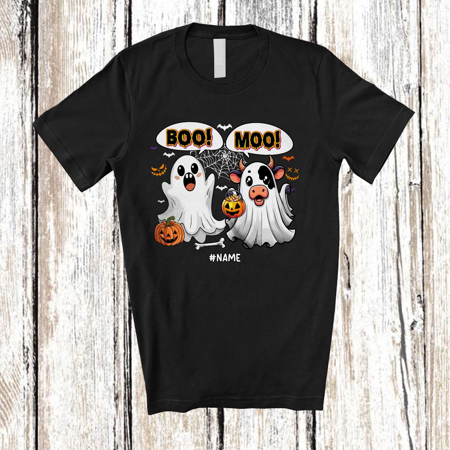 Personalized Custom Name Boo Moo; Adorable Halloween Ghost Cow Farmer; Pumpkin Candy T-Shirt. This cotton t-shirt is a durable staple product with a classic fit. One of the most popular items, it has a relaxed style made for everyday and casual wear.