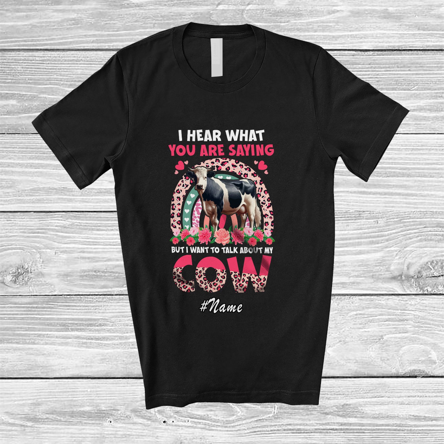 • Personalized Custom Name But I Want To Talk About My Cow; Floral Leopard Rainbow Farmer T-Shirt. This cotton t-shirt is a durable staple product with a classic fit. One of the most popular items, it has a relaxed style made for everyday and casual wear.