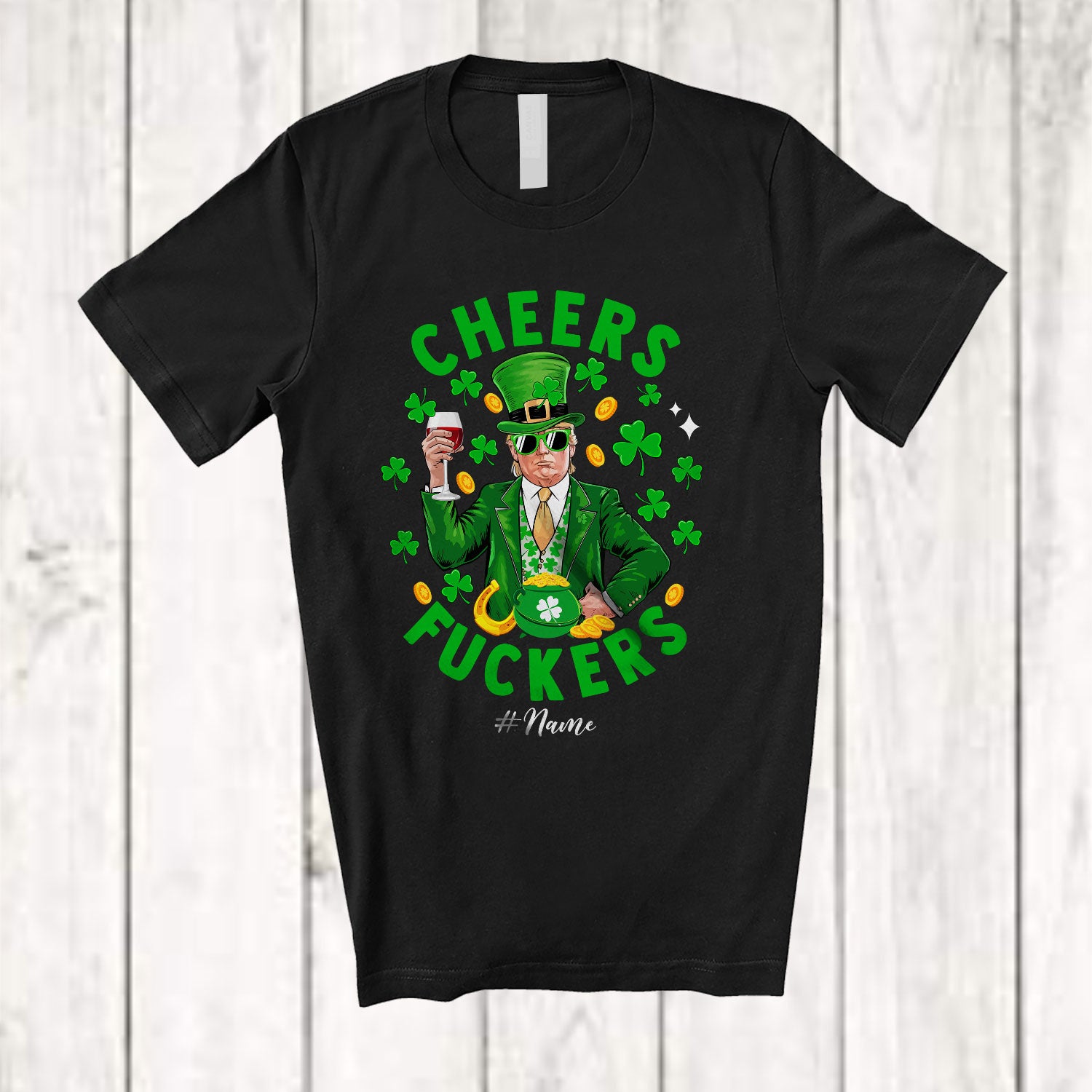 • Personalized Custom Name Cheers Fuckers; Joyful St. Patrick's Day President Trump; Drinking Wine T-Shirt. This cotton t-shirt is a durable staple product with a classic fit. One of the most popular items, it has a relaxed style made for everyday and casual wear.