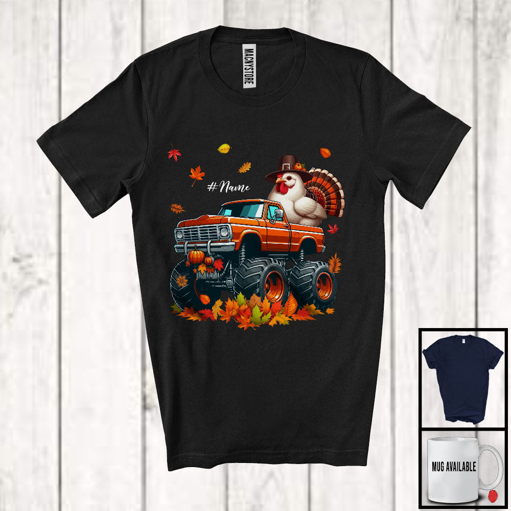 Personalized Custom Name Chicken Turkey On Monster Truck; Joyful Thanksgiving Fall Leaf T-Shirt