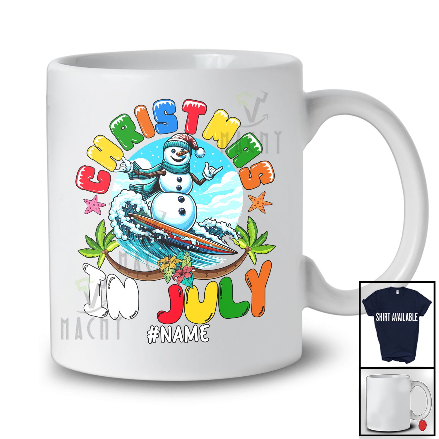 The Personalized Custom Name Christmas In July 2025; Lovely Summer Vacation Snowman Mid Year T-Shirt destined to impress, and priced at only $12.95, for a limited time.