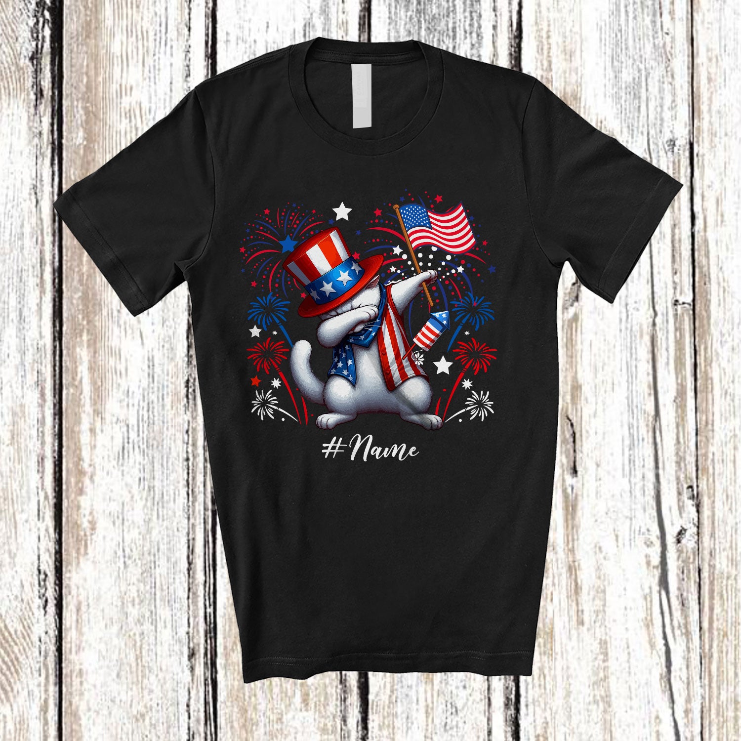 Personalized Custom Name Dabbing Cat; Lovely 4th Of July Cat American Flag; Patriotic T-Shirt. This cotton t-shirt is a durable staple product with a classic fit. One of the most popular items, it has a relaxed style made for everyday and casual wear.