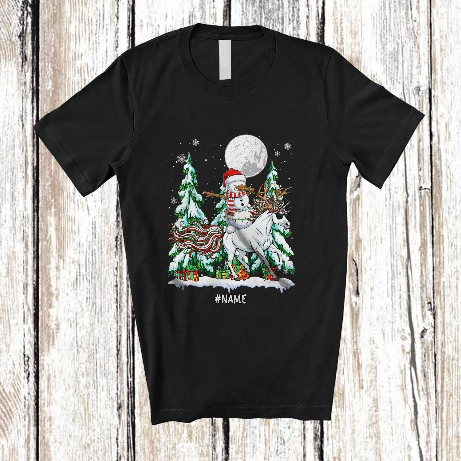 • Personalized Custom Name Dabbing Snowman Riding Unicorn Reindeer; Lovely Christmas Farmer T-Shirt. This cotton t-shirt is a durable staple product with a classic fit. One of the most popular items, it has a relaxed style made for everyday and casual wear.