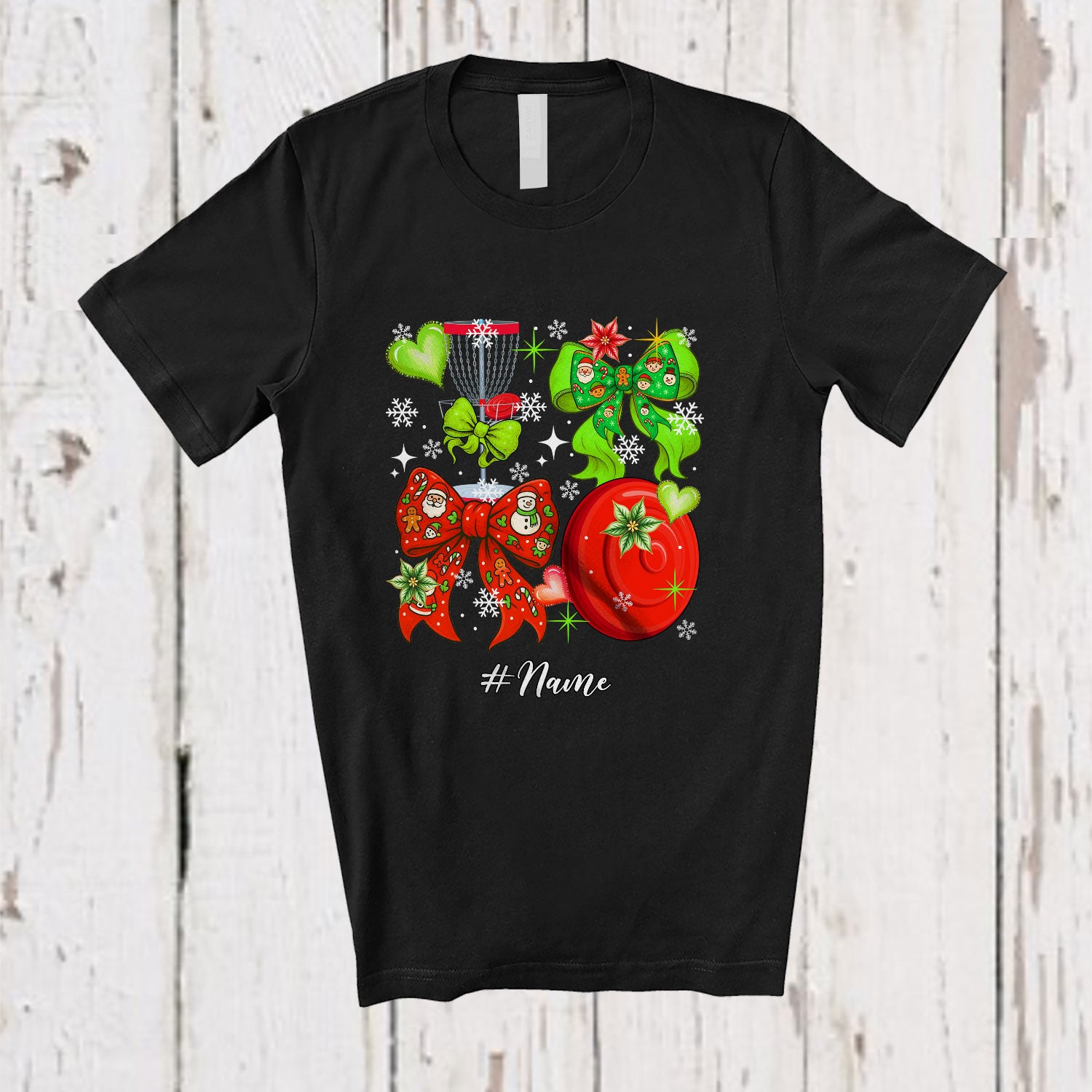 Personalized Custom Name Disc Golf Christmas Coquette; Lovely Bow Tie Snowing; Sport Player T-Shirt. This cotton t-shirt is a durable staple product with a classic fit. One of the most popular items, it has a relaxed style made for everyday and casual wear.