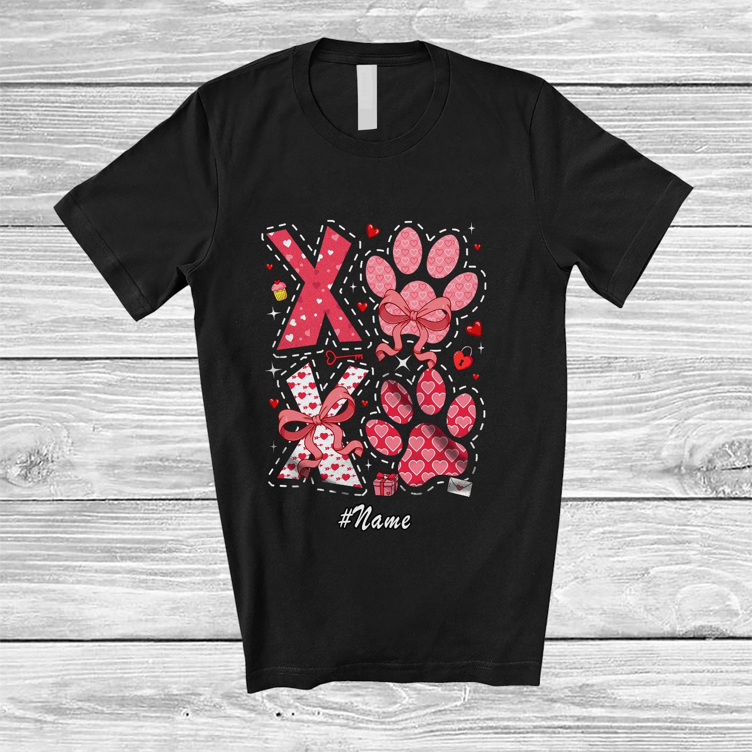 • Personalized Custom Name Dog Cat Paws With Pink Hearts Bow Tie; Lovely Valentine Dog Owner Lover T-Shirt. This cotton t-shirt is a durable staple product with a classic fit. One of the most popular items, it has a relaxed style made for everyday and casual wear.