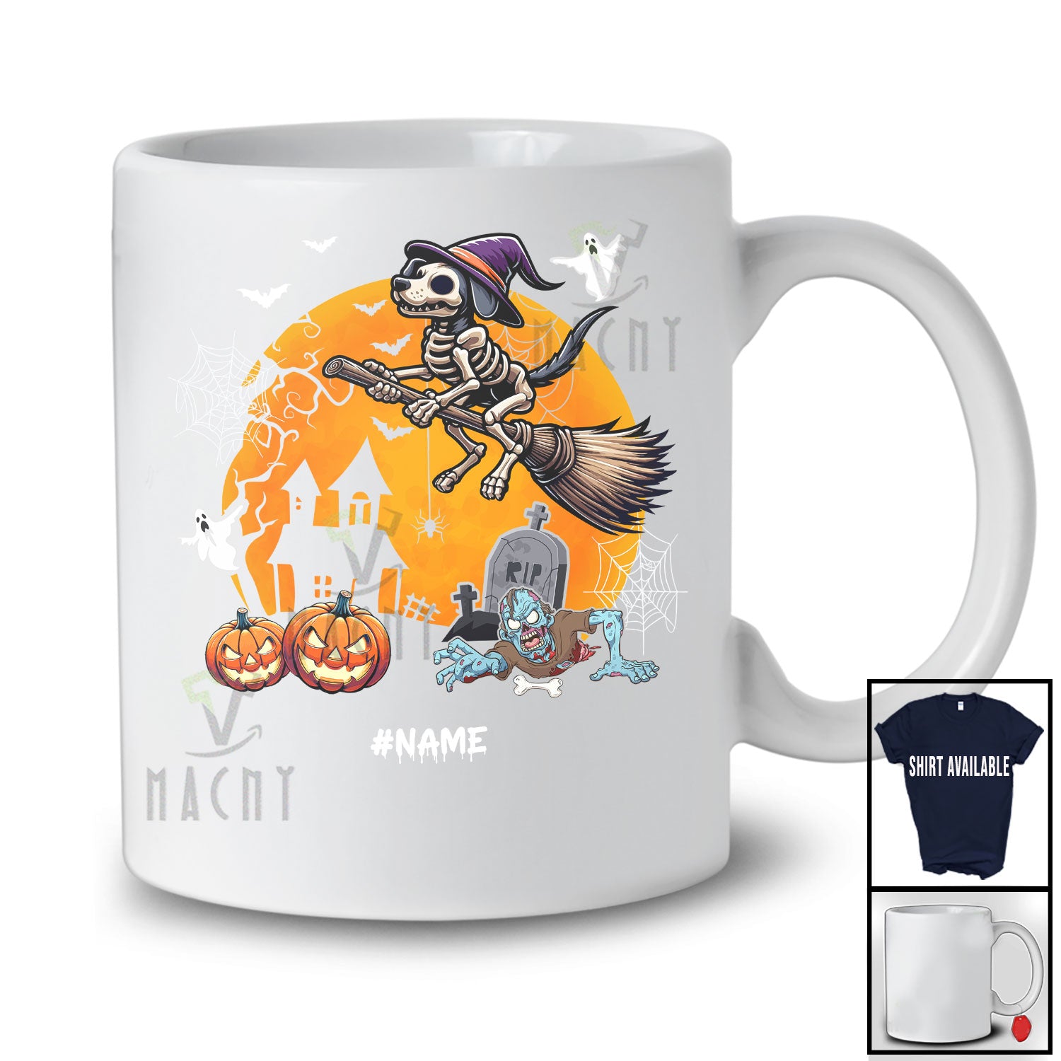 • Personalized Custom Name Dog Skeleton Witch On Broomstick; Lovely Halloween Moon Zombie T-Shirt. This cotton t-shirt is a durable staple product with a classic fit. One of the most popular items, it has a relaxed style made for everyday and casual wear.