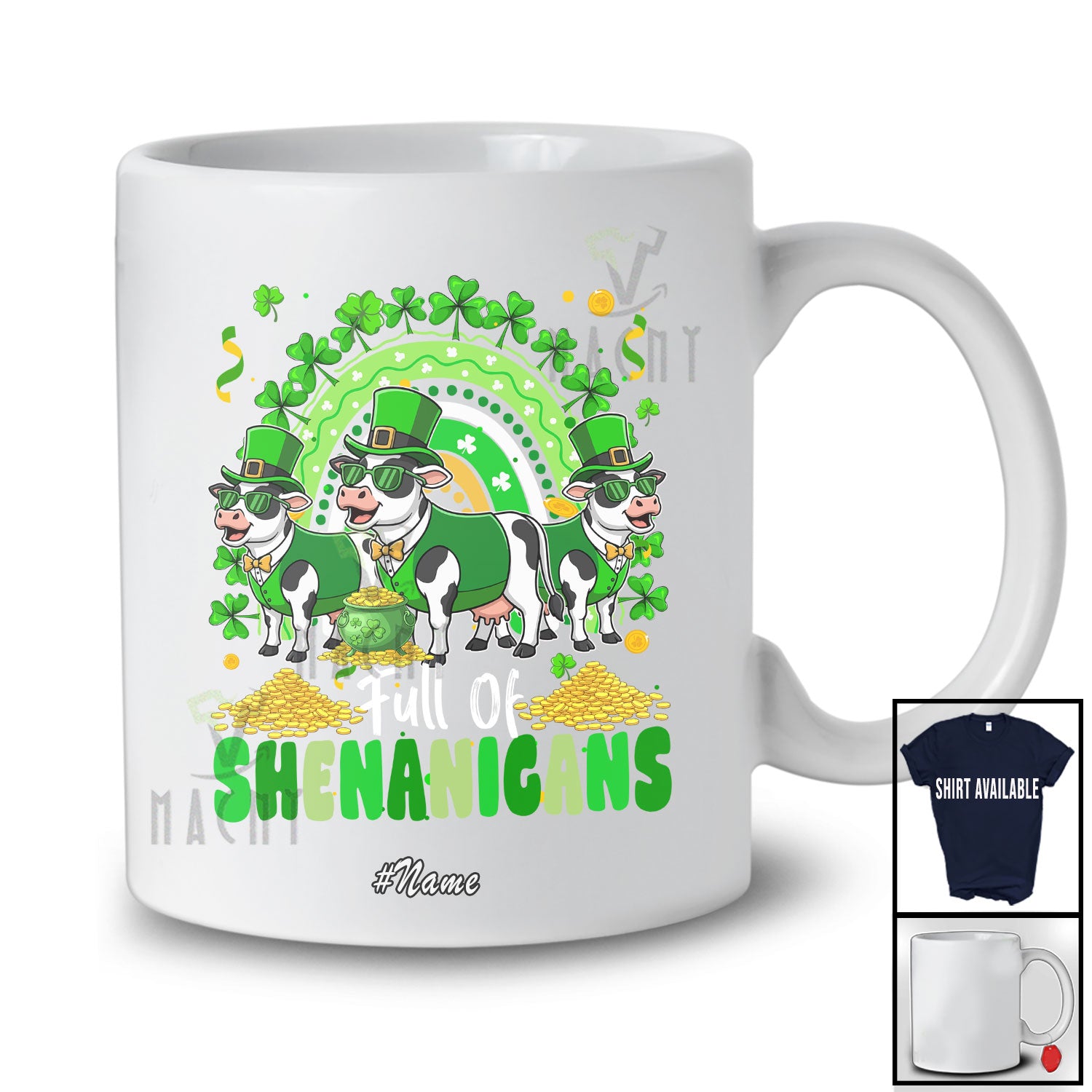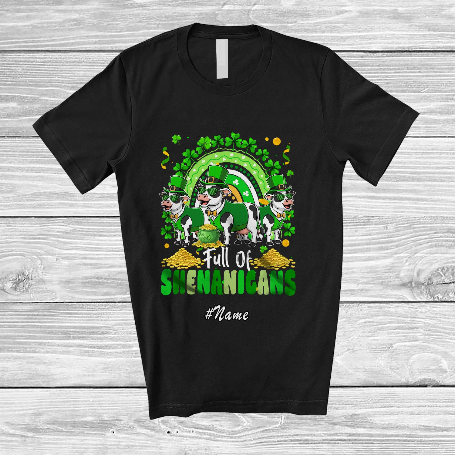 Personalized Custom Name Full Of Shenanigans; Happy St. Patrick's Day Three Cow Rainbow Farmer T-Shirt. This cotton t-shirt is a durable staple product with a classic fit. One of the most popular items, it has a relaxed style made for everyday and casual wear.