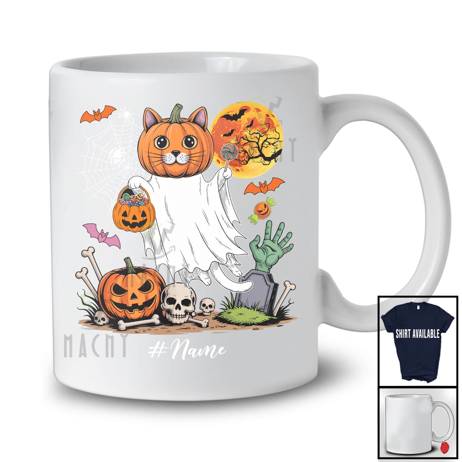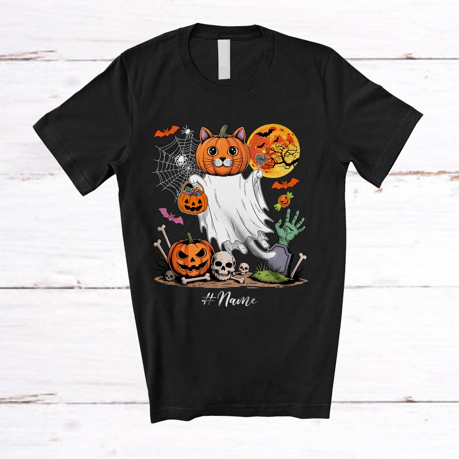 new MacnyStore - Personalized Custom Name Ghost Cat Pumpkin Face; Humorous Halloween Costume Animal T-Shirt – Macnystore