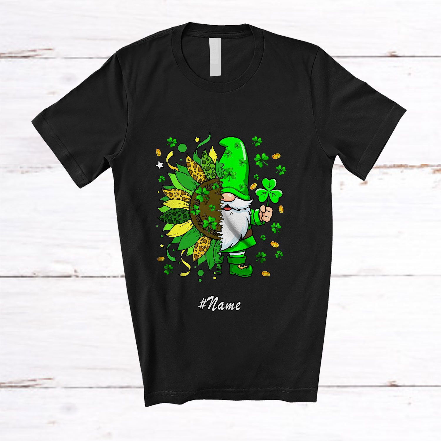 Personalized Custom Name Gnome Half Leopard Sunflower; Lovely St. Patrick's Day Lucky Shamrock T-Shirt