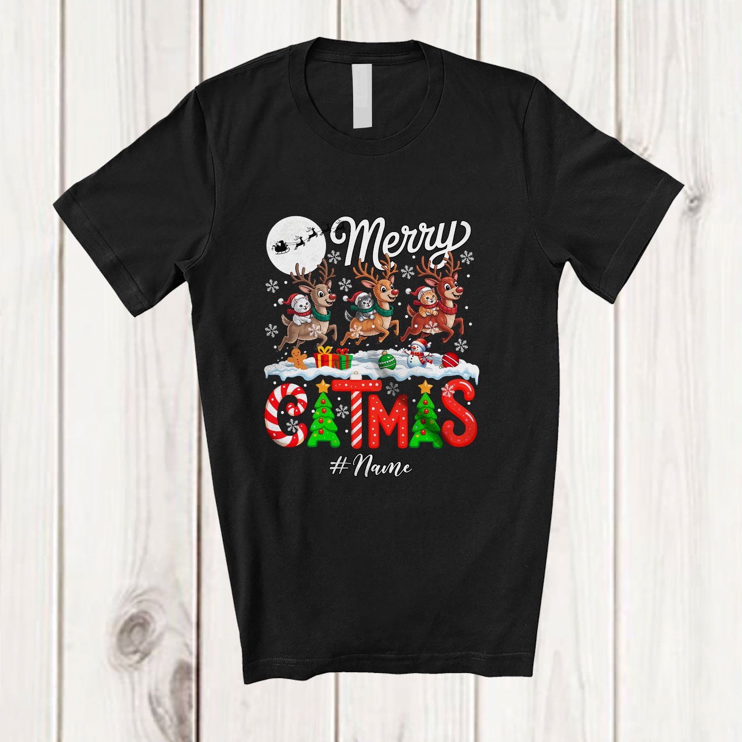 • Personalized Custom Name Happy Catsmas; Lovely Christmas Three Cats Riding Reindeer T-Shirt. This cotton t-shirt is a durable staple product with a classic fit. One of the most popular items, it has a relaxed style made for everyday and casual wear.