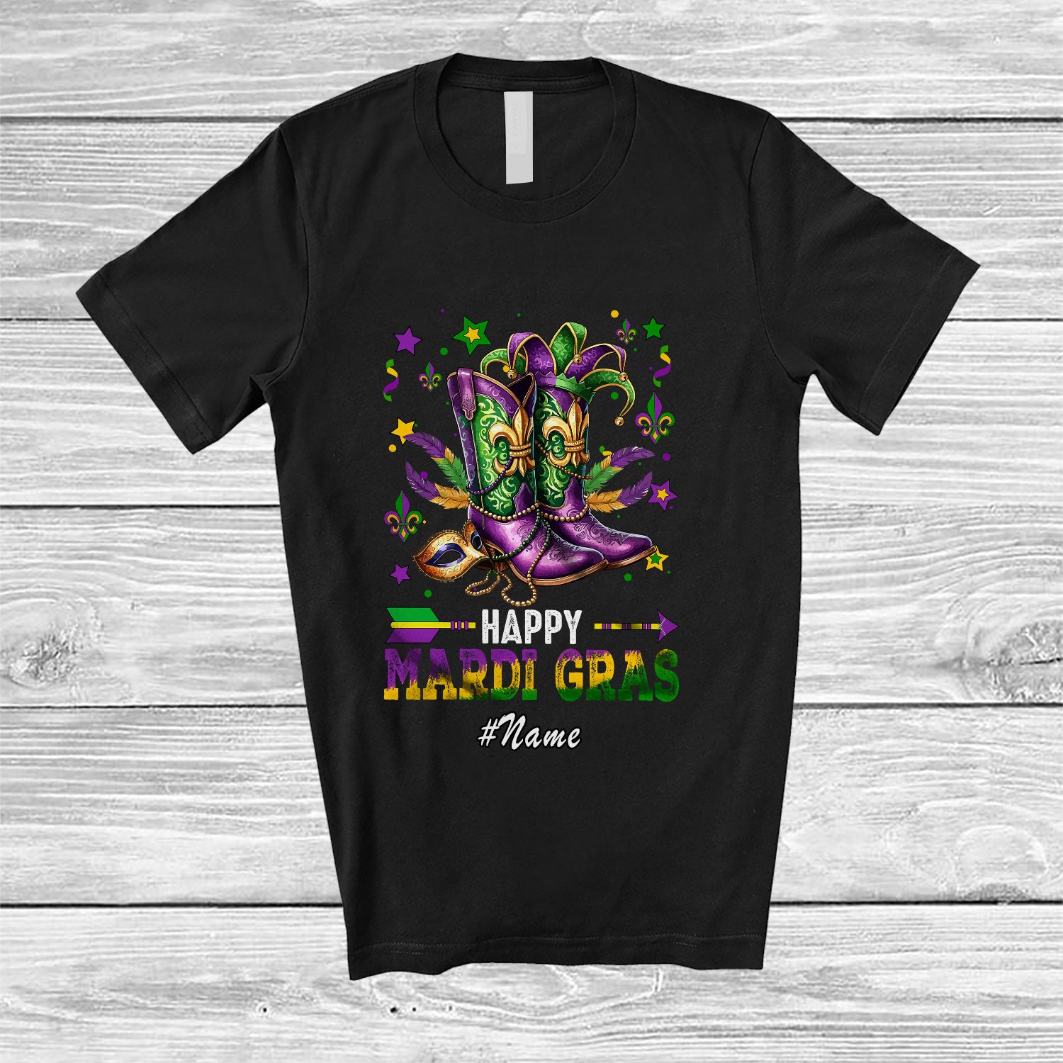 Personalized Custom Name Happy Mardi Gras; Humorous Western Cowboy Boots; Parades Group T-Shirt. This cotton t-shirt is a durable staple product with a classic fit. One of the most popular items, it has a relaxed style made for everyday and casual wear.