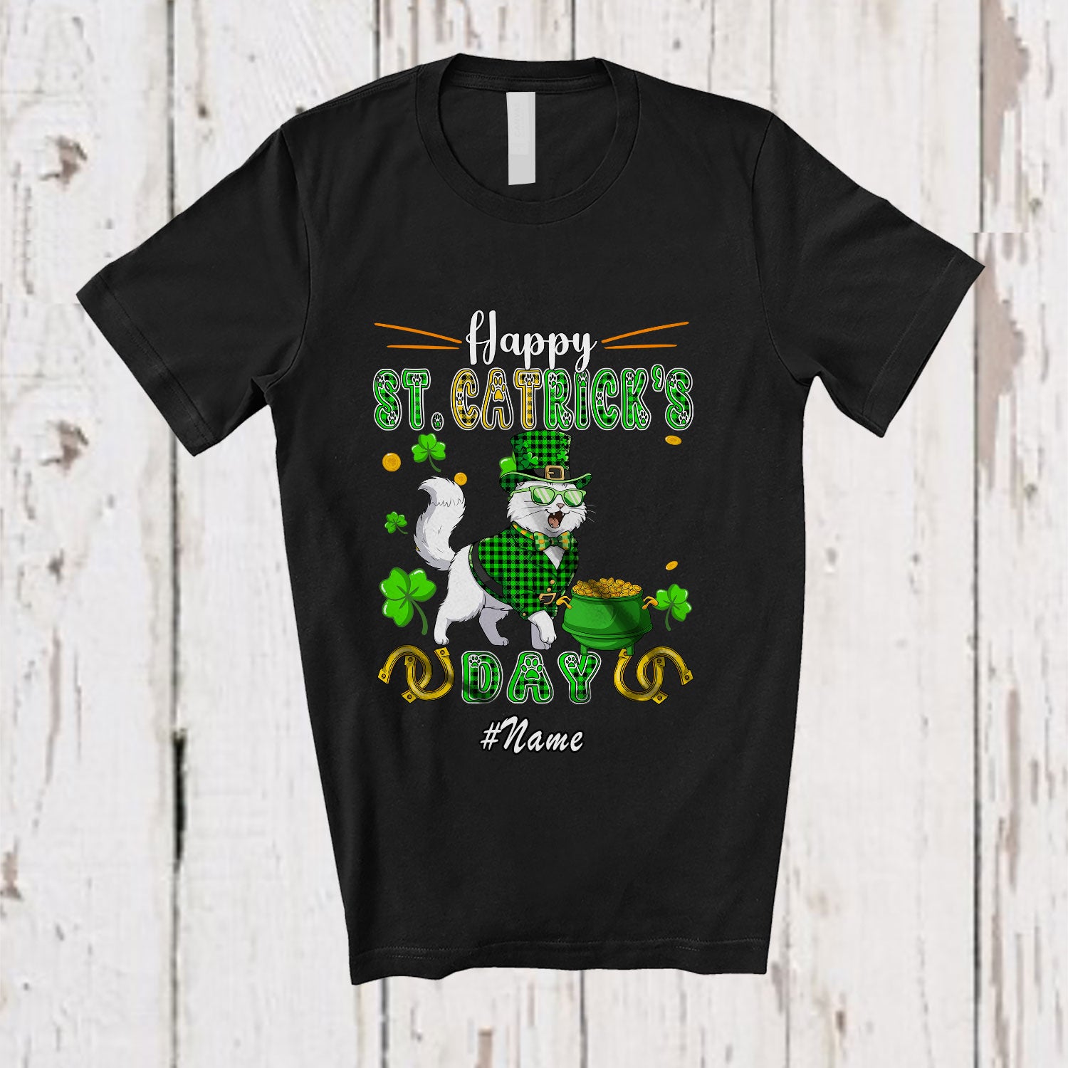 Personalized Custom Name Happy St. Catrick's Day; Humorous St. Patrick's Day Plaid Cat Owner T-Shirt