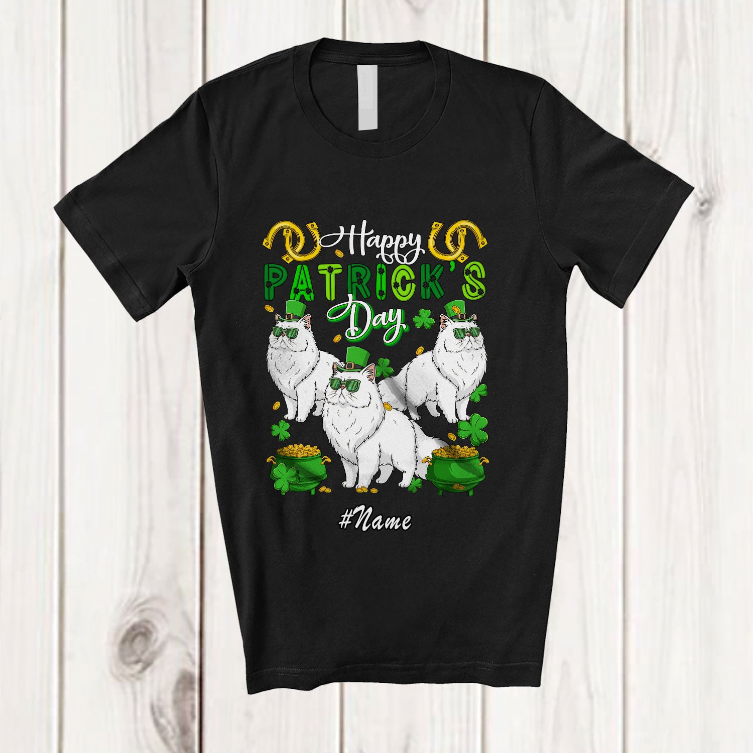 • Personalized Custom Name Happy St. Patrick's Day; Amusing Three Leprechaun Persian Cat Owner T-Shirt. This cotton t-shirt is a durable staple product with a classic fit. One of the most popular items, it has a relaxed style made for everyday and casual wear.