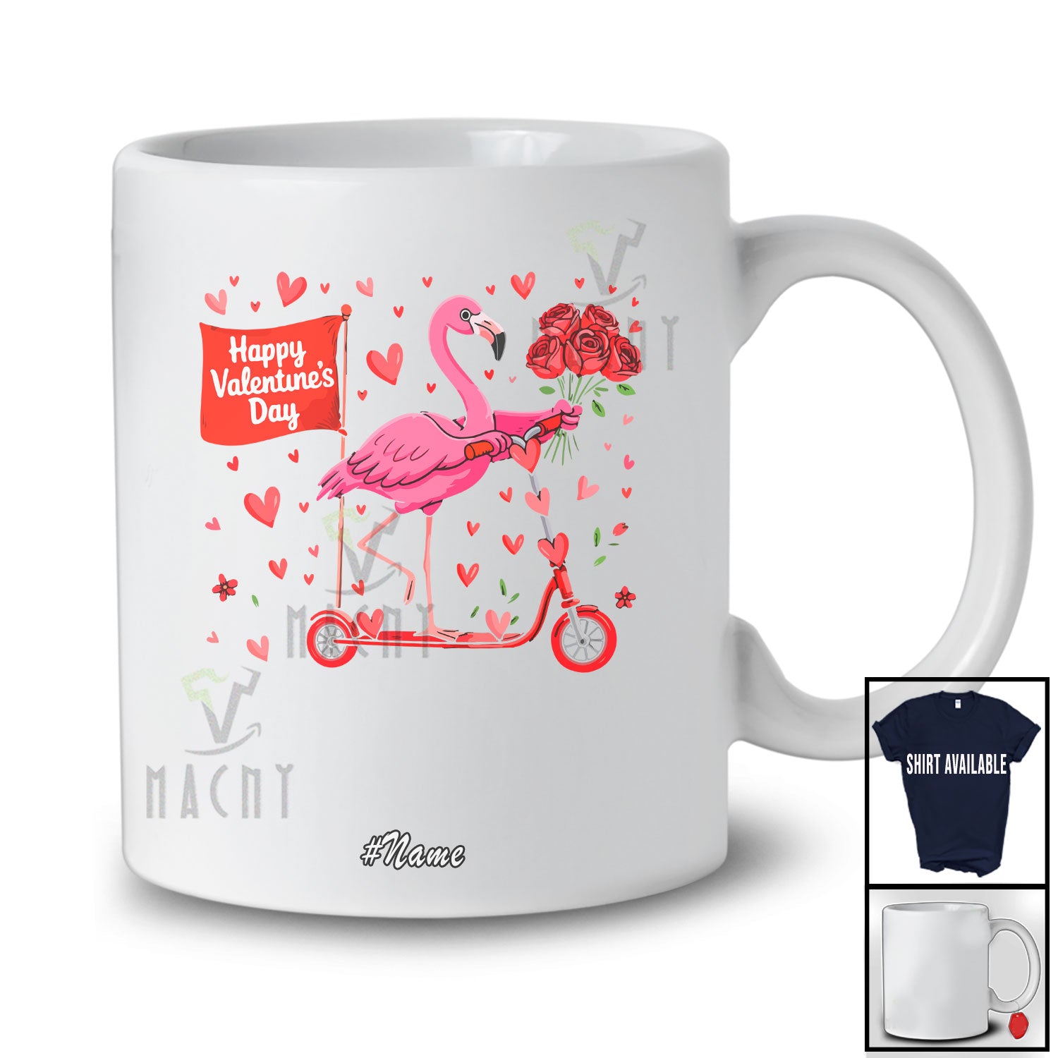 new MacnyStore - Personalized Custom Name Happy Valentine's Day; Lovely Hearts Flowers Flamingo Riding Scoter T-Shirt – Macnystore
