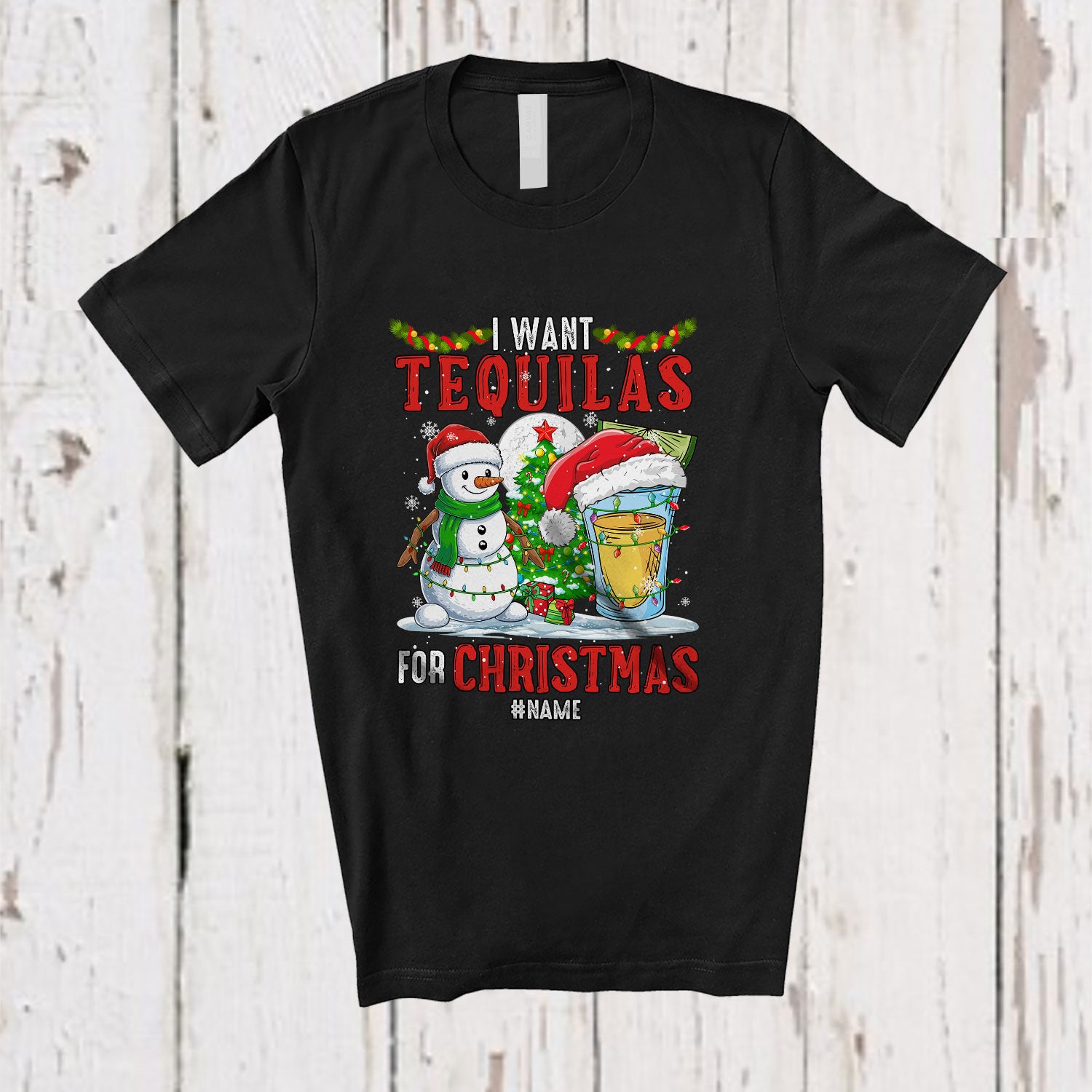 Personalized Custom Name I Want Tequilas For Christmas; Cheerful Santa Drinking Drunker T-Shirt. This cotton t-shirt is a durable staple product with a classic fit. One of the most popular items, it has a relaxed style made for everyday and casual wear.