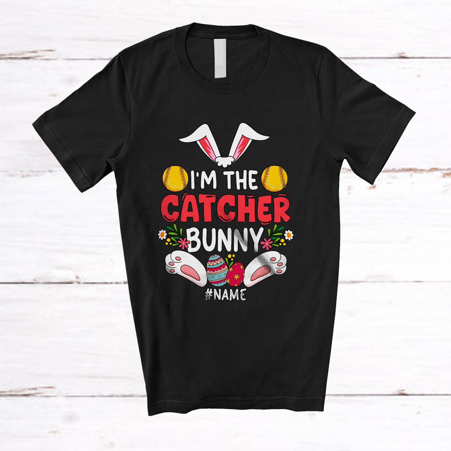 • Personalized Custom Name I'm The Catcher Bunny; Lovely Easter Eggs Hunting; Softball Player T-Shirt. This cotton t-shirt is a durable staple product with a classic fit. One of the most popular items, it has a relaxed style made for everyday and casual wear.
