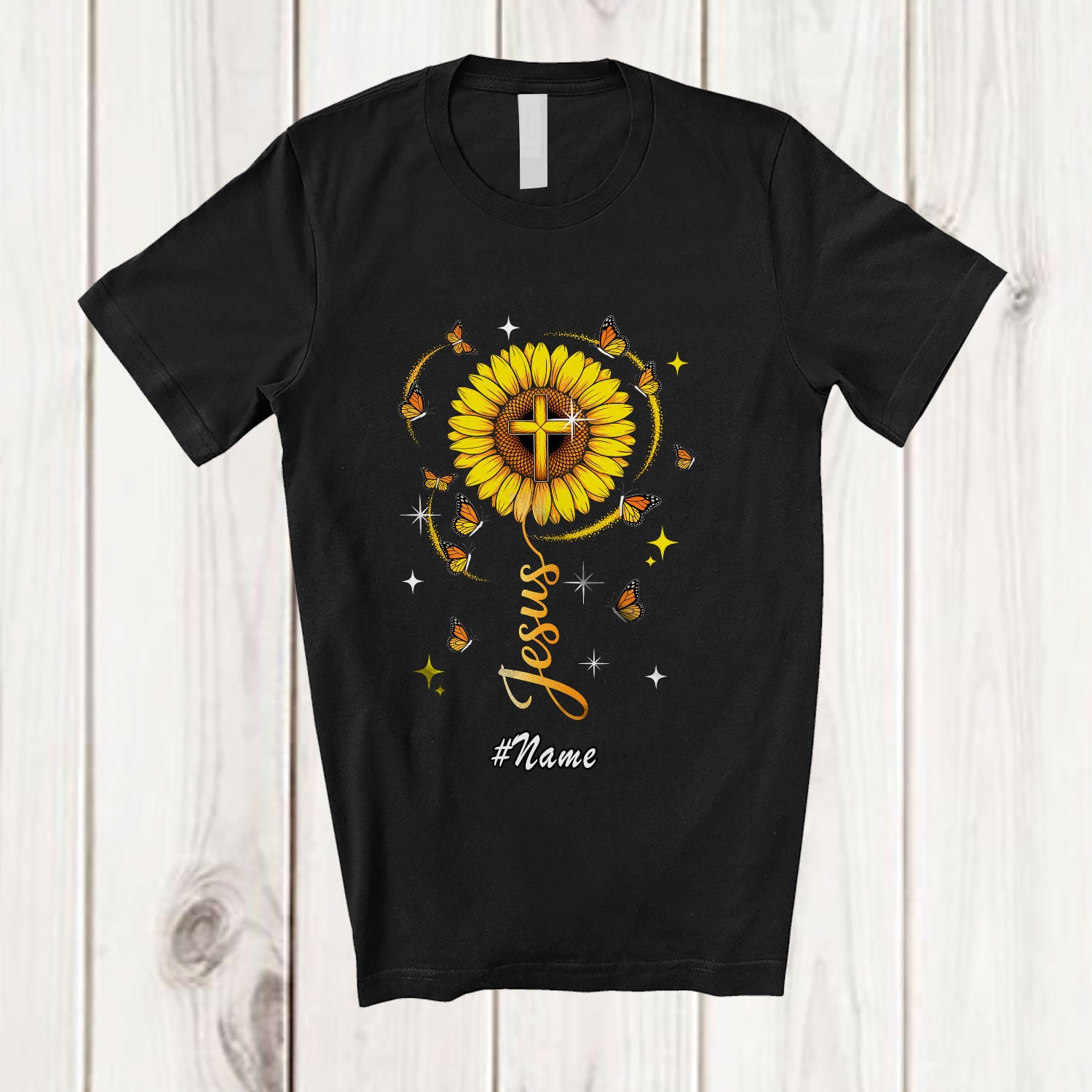 • Personalized Custom Name Jesus; Adorable Sunflower Flowers With Butterflies; Family Group T-Shirt. This cotton t-shirt is a durable staple product with a classic fit. One of the most popular items, it has a relaxed style made for everyday and casual wear.