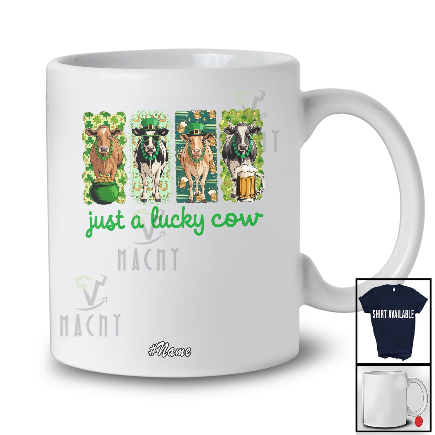 Personalized Custom Name Just A Lucky Cow; Lovely St. Patrick's Day Shamrock Cow; Farm Animal Farmer T-Shirt. This cotton t-shirt is a durable staple product with a classic fit. One of the most popular items, it has a relaxed style made for everyday and casual wear.