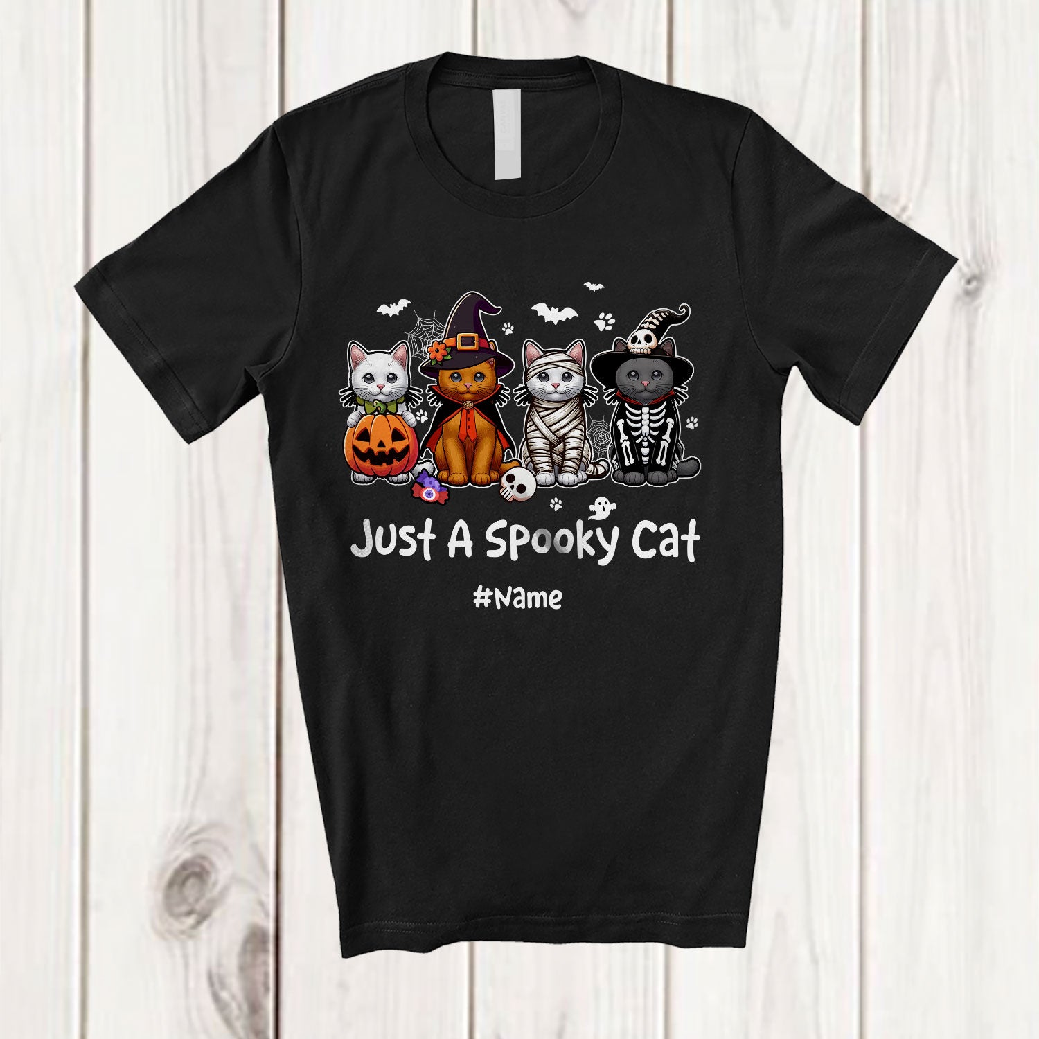 Personalized Custom Name Just A Spooky Cat; Horror Halloween Witch Skeleton Cat Paws T-Shirt. This cotton t-shirt is a durable staple product with a classic fit. One of the most popular items, it has a relaxed style made for everyday and casual wear.