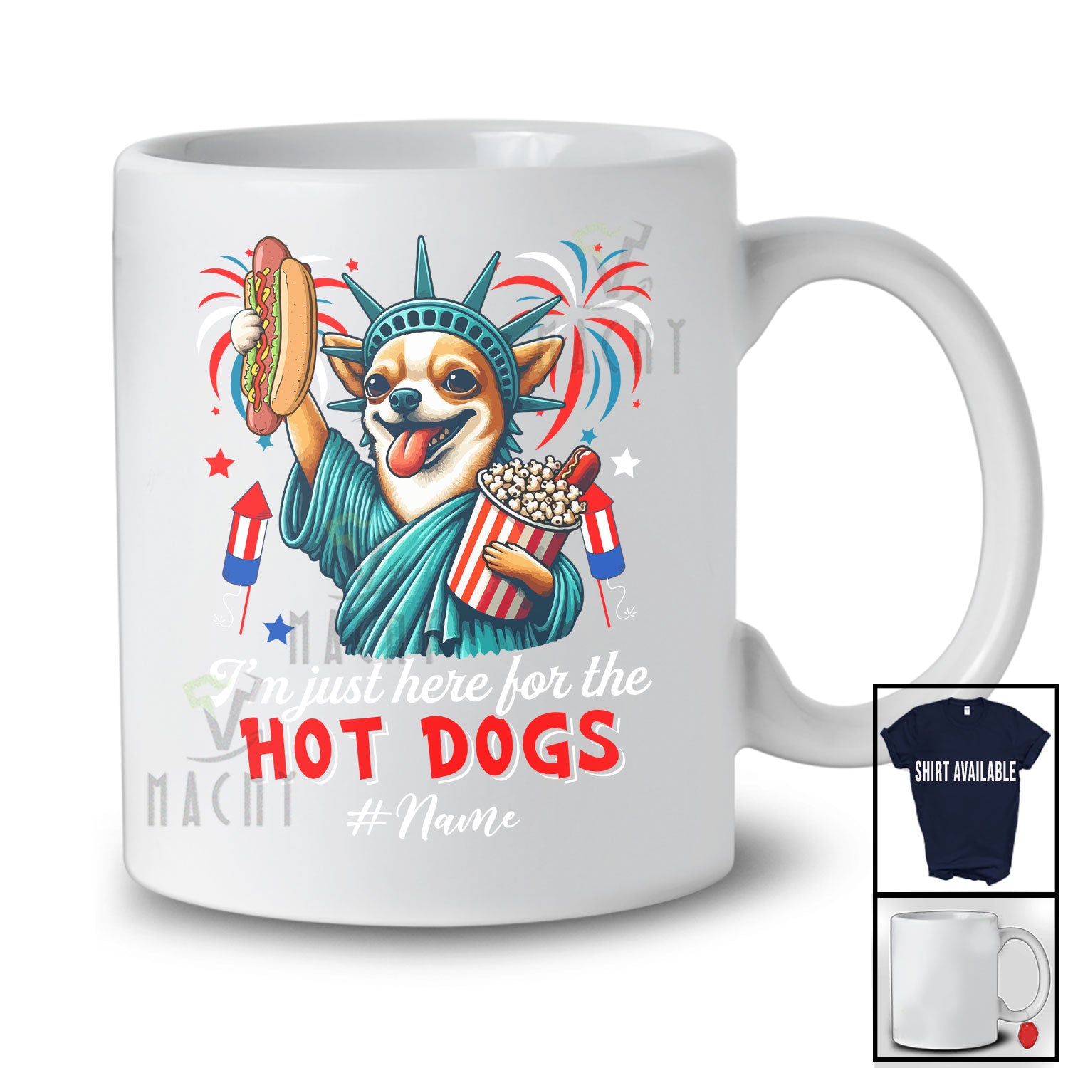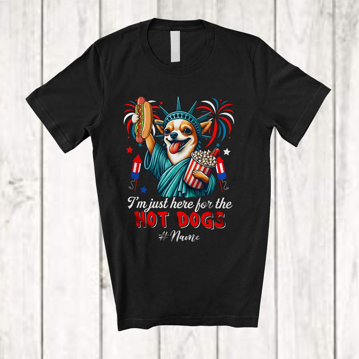 • Personalized Custom Name Just Here For The Hot Dogs; Proud Chihuahua Liberty Patriotic T-Shirt. This cotton t-shirt is a durable staple product with a classic fit. One of the most popular items, it has a relaxed style made for everyday and casual wear.