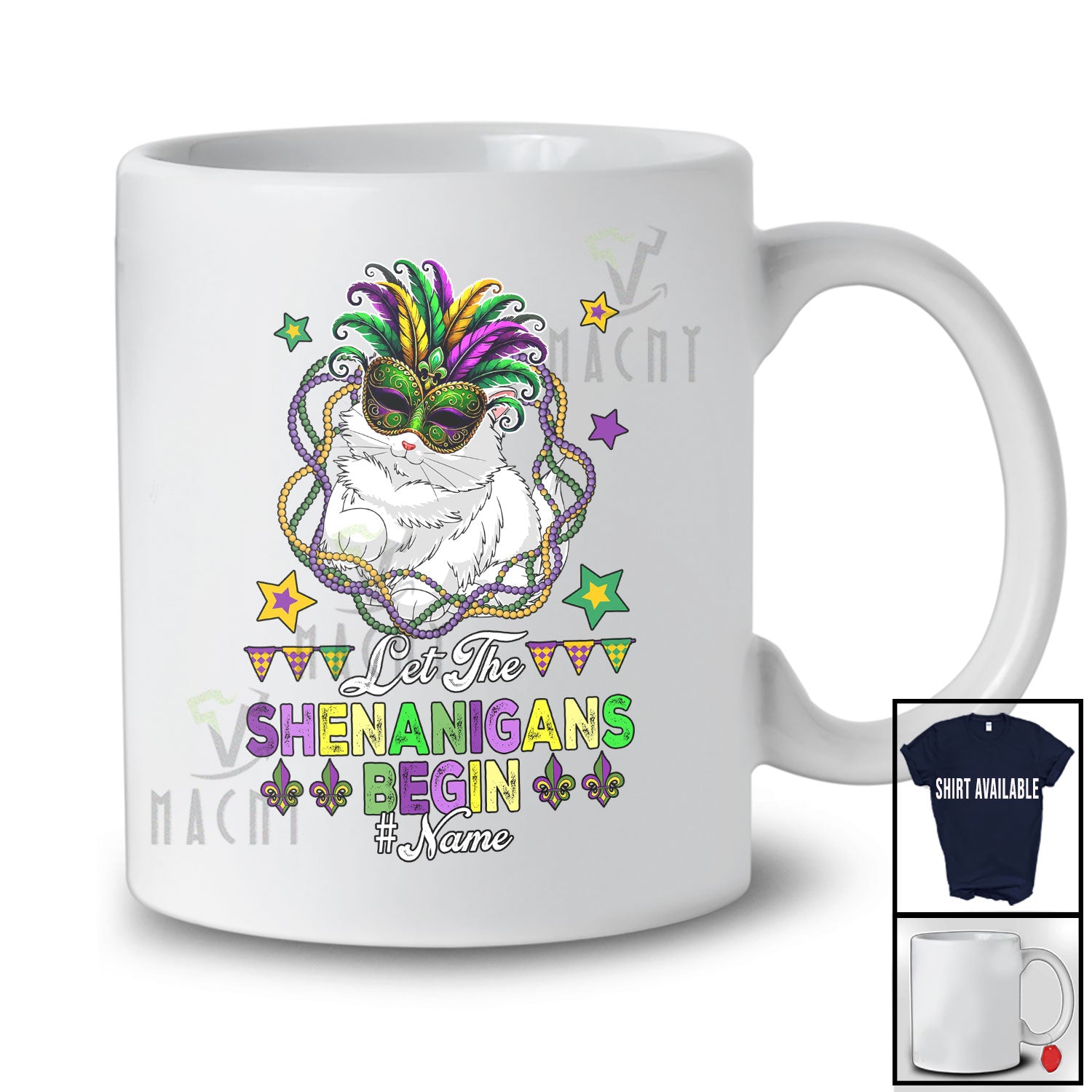 Personalized Custom Name Let The Shenanigans Begin; Joyful Mardi Gras Masked Cat Beads T-Shirt. This cotton t-shirt is a durable staple product with a classic fit. One of the most popular items, it has a relaxed style made for everyday and casual wear.