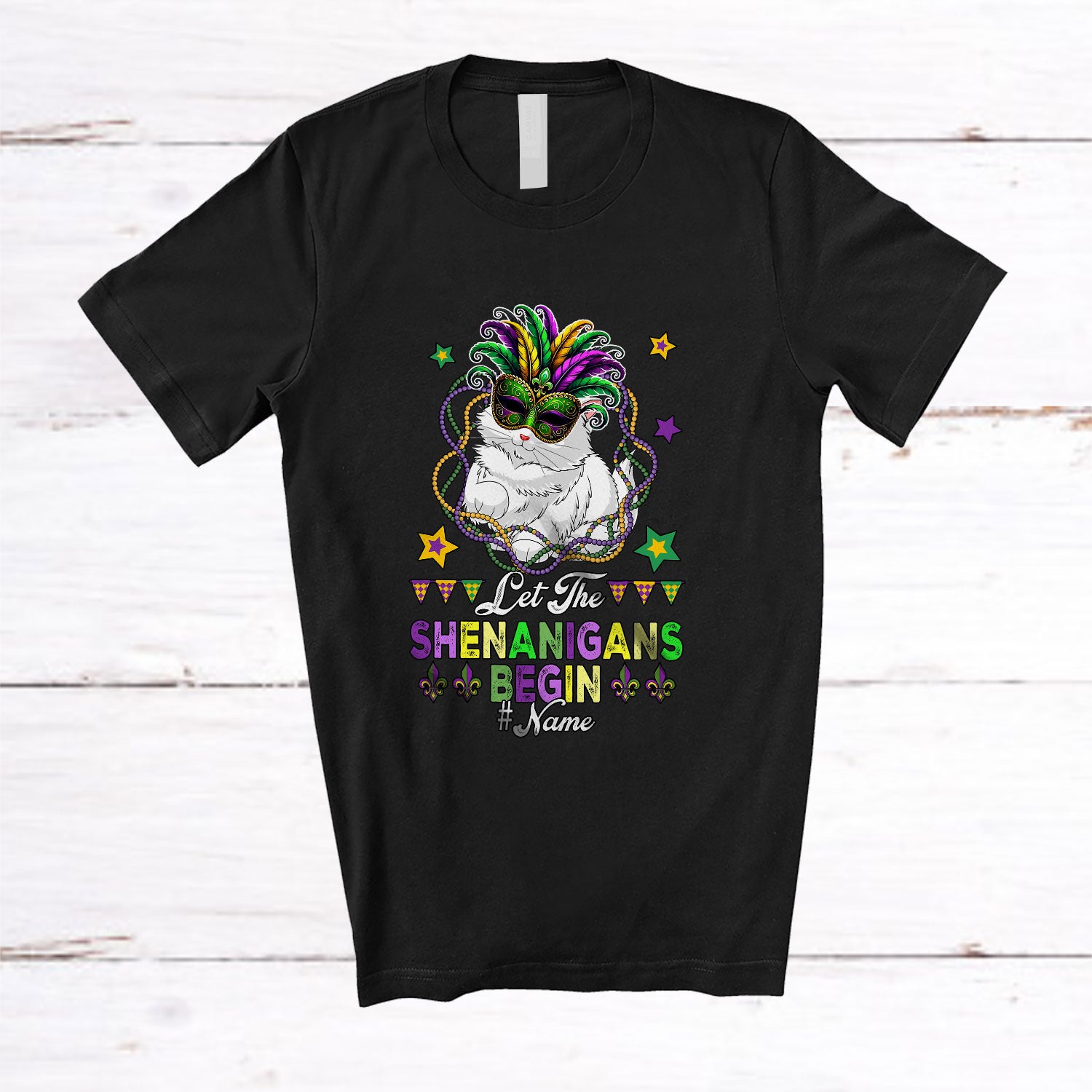 Personalized Custom Name Let The Shenanigans Begin; Joyful Mardi Gras Masked Cat Beads T-Shirt