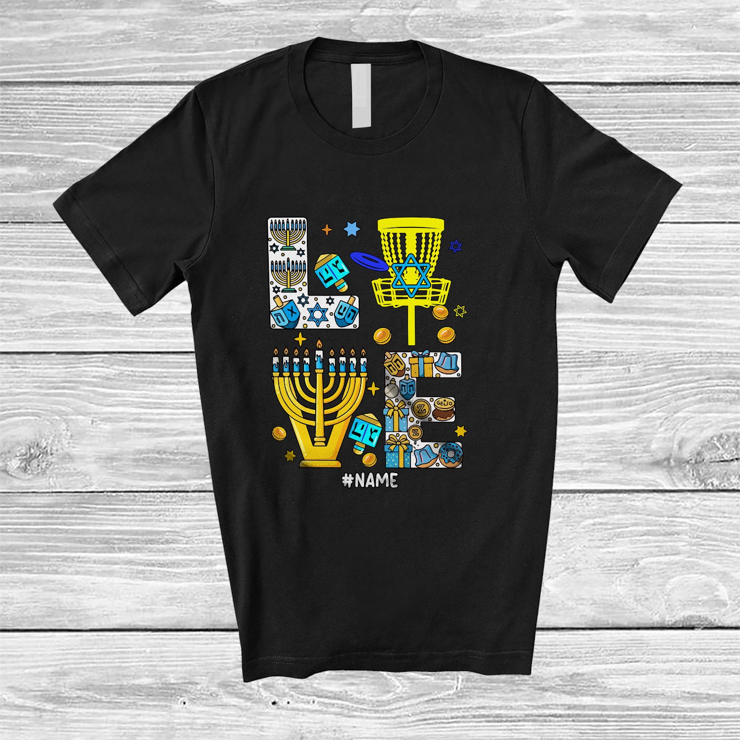 Personalized Custom Name LOVE; Lovely Hanukkah Menorah Disc Golf Player; Sport Playing Team T-Shirt. This cotton t-shirt is a durable staple product with a classic fit. One of the most popular items, it has a relaxed style made for everyday and casual wear.