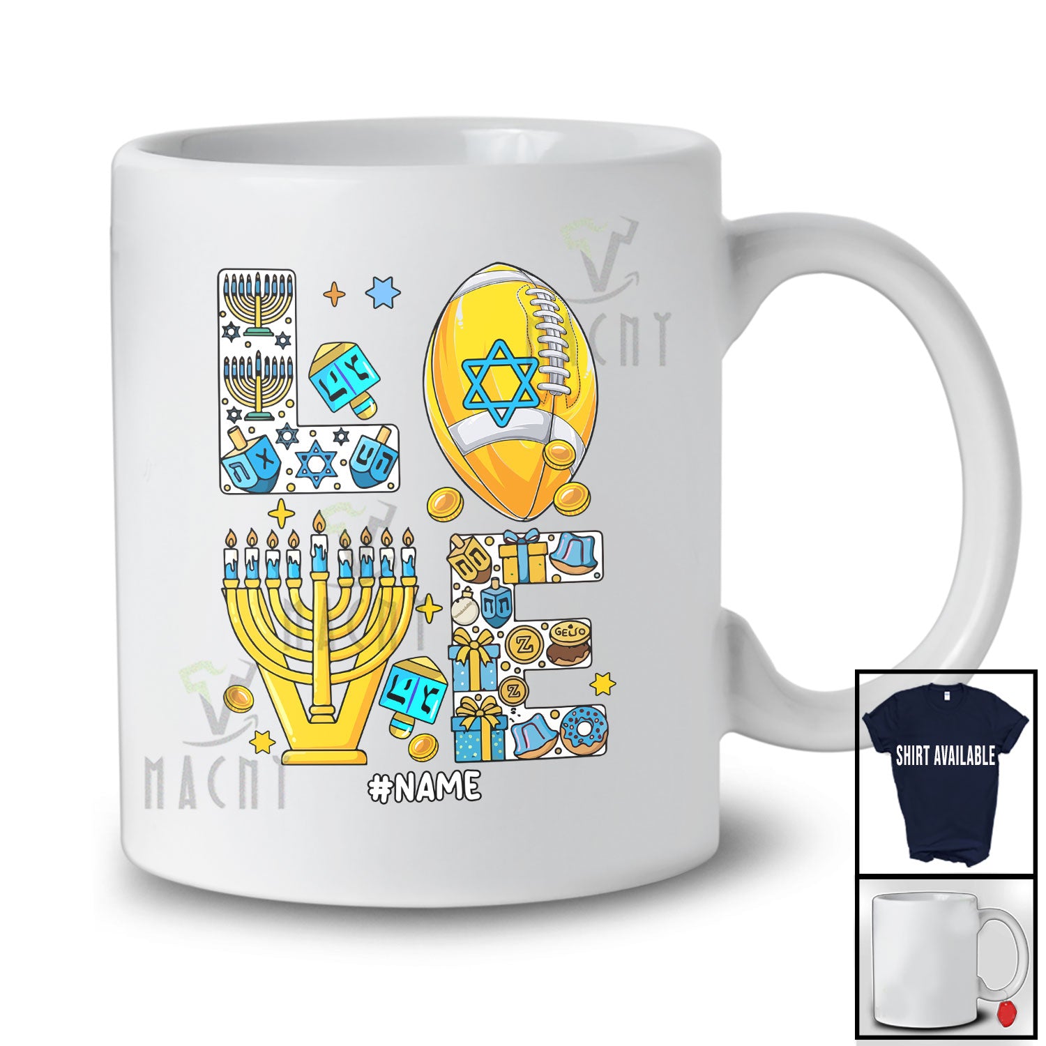 Personalized Custom Name LOVE; Lovely Hanukkah Menorah Football Player; Sport Playing Team T-Shirt. This cotton t-shirt is a durable staple product with a classic fit. One of the most popular items, it has a relaxed style made for everyday and casual wear.