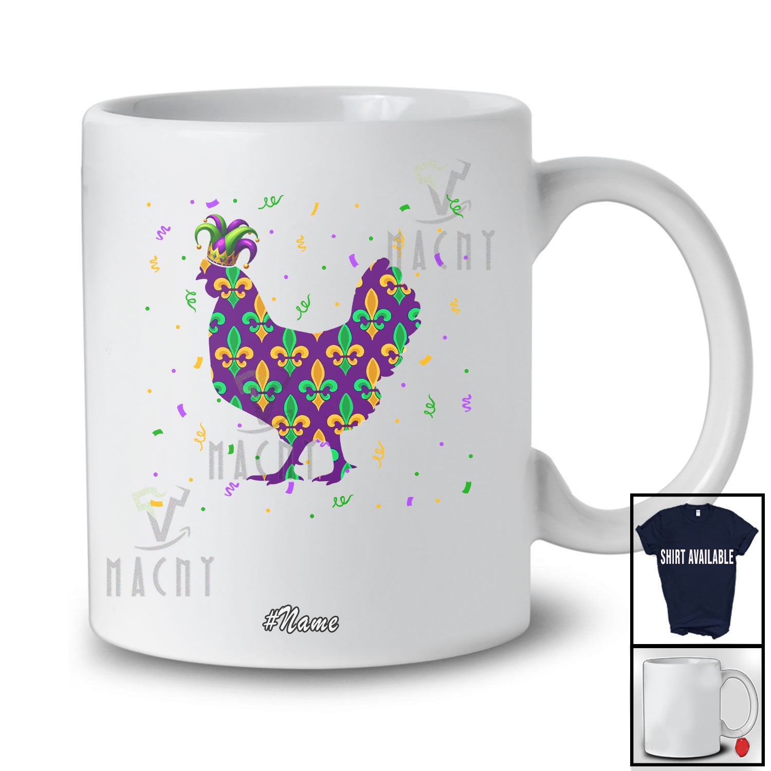 Personalized Custom Name Mardi Gras Chicken Shape; Lovely Farm Animal Farmer; Parades Group T-Shirt. This cotton t-shirt is a durable staple product with a classic fit. One of the most popular items, it has a relaxed style made for everyday and casual wear.