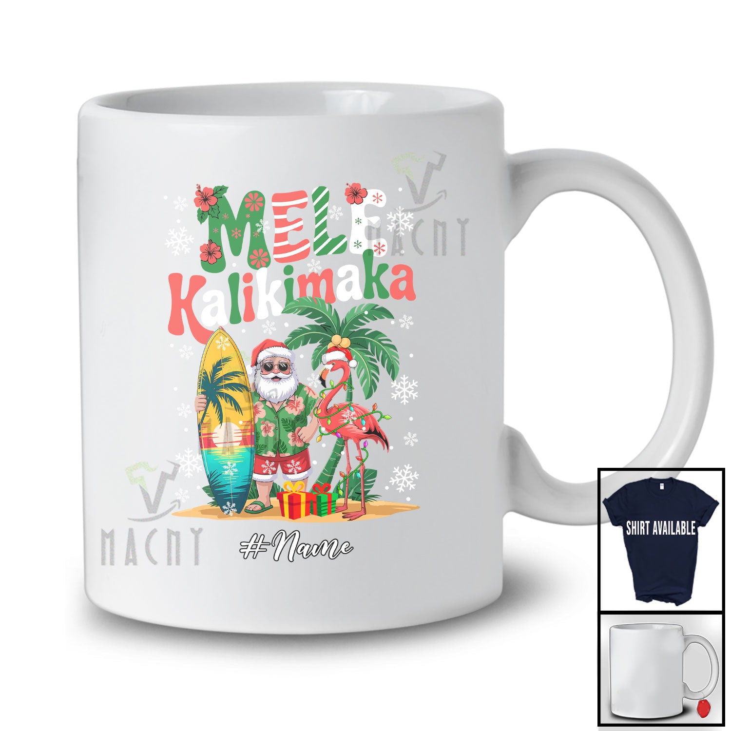 Personalized Custom Name Mele Kalikimaka; Lovely Christmas Hawaiian Flamingo Santa; Surfing Surfer T-Shirt. This cotton t-shirt is a durable staple product with a classic fit. One of the most popular items, it has a relaxed style made for everyday and casual wear.
