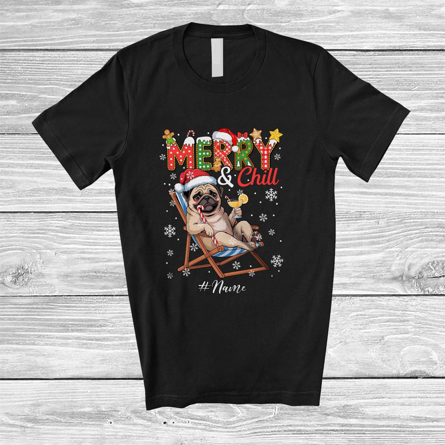 Personalized Custom Name Merry And Chill; Lovely Christmas Holiday Vacation Santa Pug T-Shirt