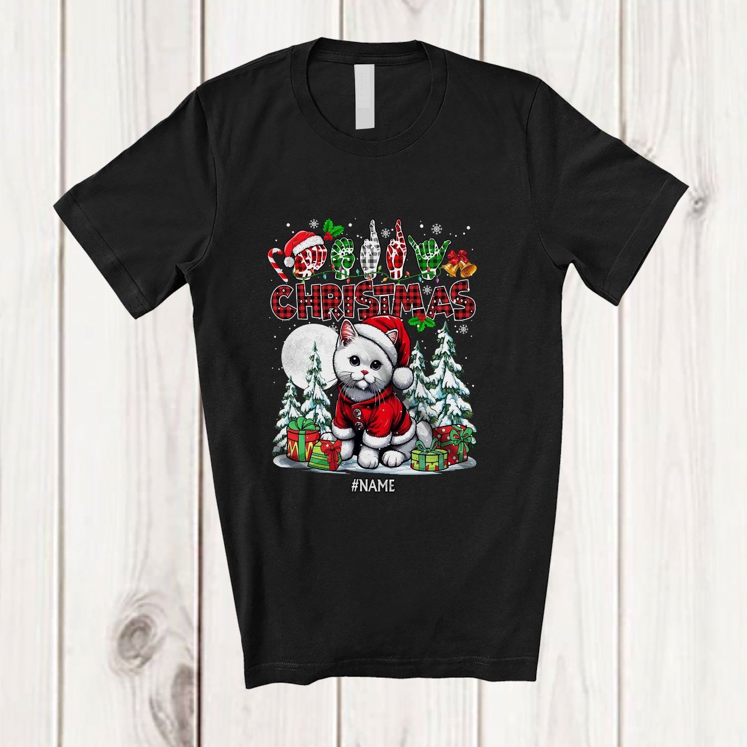 Personalized Custom Name Merry Christmas ASL Sign Language; Lovely Plaid Santa Cat T-Shirt