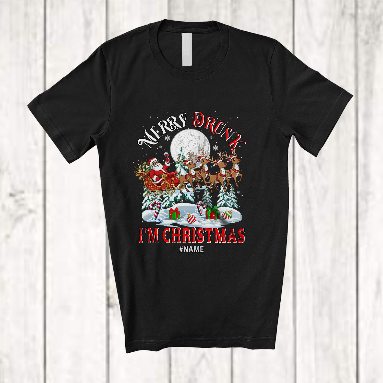 Personalized Custom Name Merry Drunk Christmas; Cheerful Santa Drinking Wine On X-mas Sleigh T-Shirt