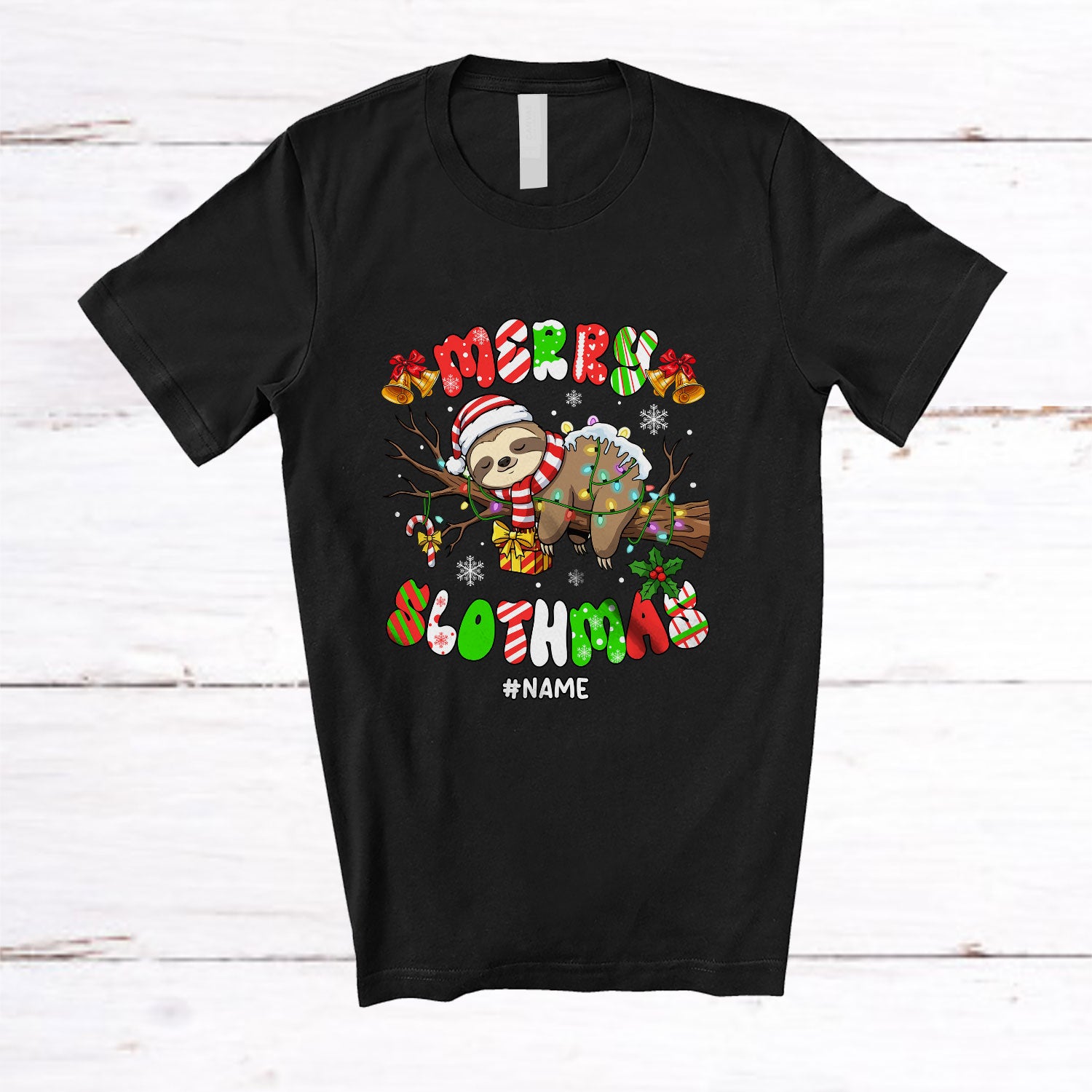 • Personalized Custom Name Merry Slothmas; Humorous Christmas Hanging Sloth; X-mas Lights T-Shirt. This cotton t-shirt is a durable staple product with a classic fit. One of the most popular items, it has a relaxed style made for everyday and casual wear.