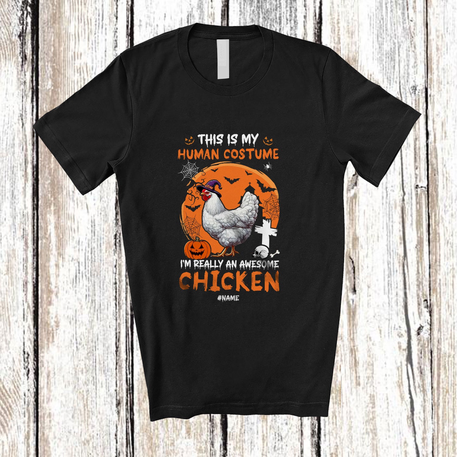 • Personalized Custom Name My Human Costume Chicken; Creepy Halloween Moon Animal Witch T-Shirt. This cotton t-shirt is a durable staple product with a classic fit. One of the most popular items, it has a relaxed style made for everyday and casual wear.