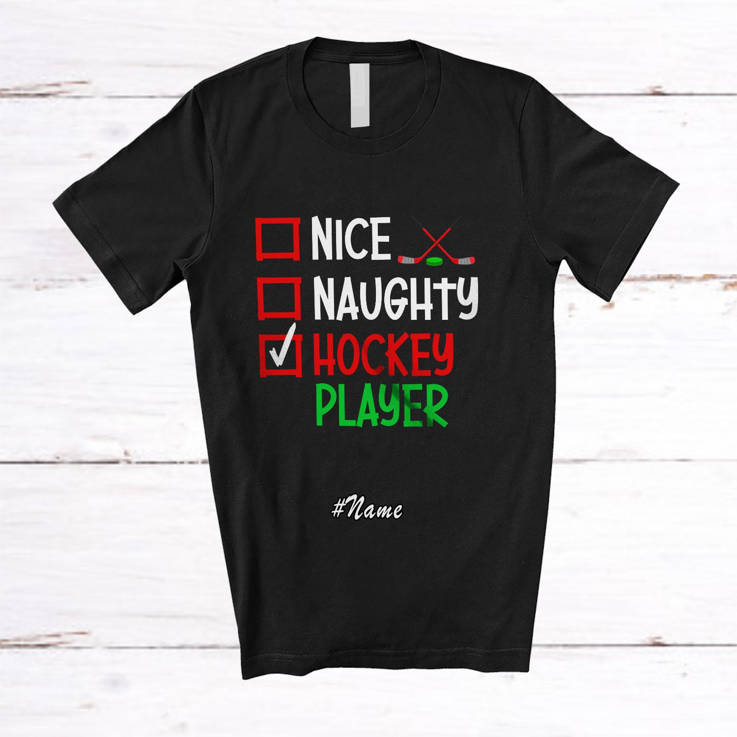 • Every product is unique, just like you. If you're looking for a product that fits the mold of your life, the Personalized Custom Name Nice Naughty Hockey Player; Humorous Christmas Playing Sport T-Shirt is for you.